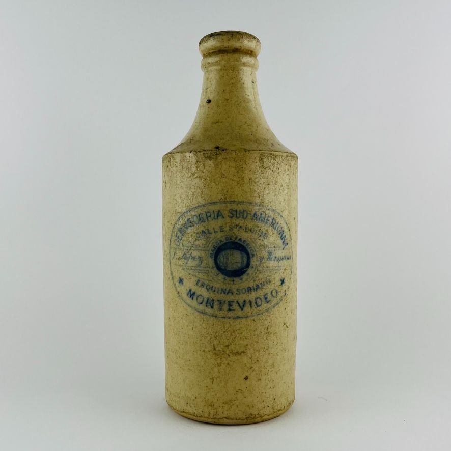 Botella de cerveza uruguaya en gres. «Cervecería Sudamericana. F. López y Hermanos. Calle Santa Lucía esquina Soriano. Montevideo.» Marca estampada en azul. Alto 23 cm.