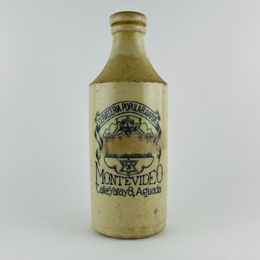Botella de cerveza uruguaya en gres. «Cervecería Popular á Vapor. C. Niding. Montevideo. Calle Yatay No. 8, Aguada.» Doble marca estampada en negro, con nombre Niding borrado tras el cambio de propietario. Botella de transición. Alto 23.5 cm.