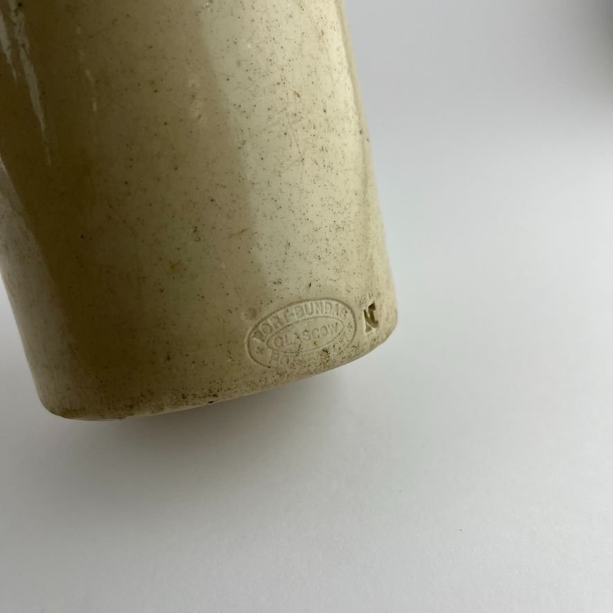 Botella de cerveza uruguaya en gres. «Cervecería Nacional San José de Mayo. Marca de Fábrica. E. Ueltschi y Cía.» Etiqueta oval en cerámica celeste. Sello inciso del fabricante por Port Dundas, Glasgow. Cascadura en pico. Alto 23 cm.
