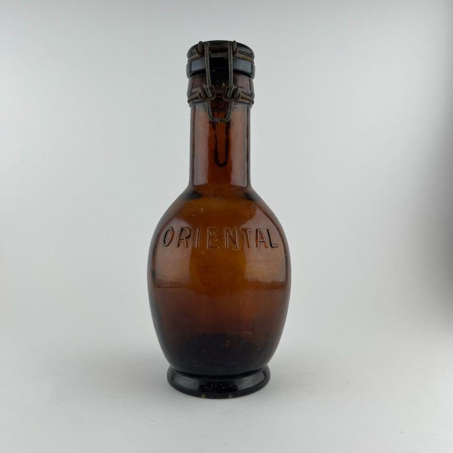Botella de cerveza uruguaya en vidrio marrón prensado. «Cervecería Oriental». Marca en relieve. Tapón en vidrio y alambre. Alto 27 cm.