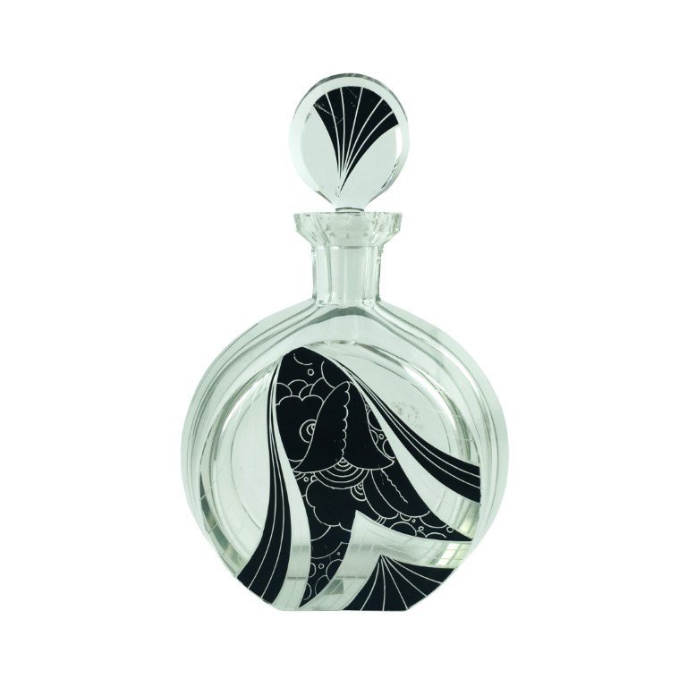 Botellón art decó en cristal tallado, decorado «flores» en esmalte negro. Con tapón. 25 x 16 x 8 cm.