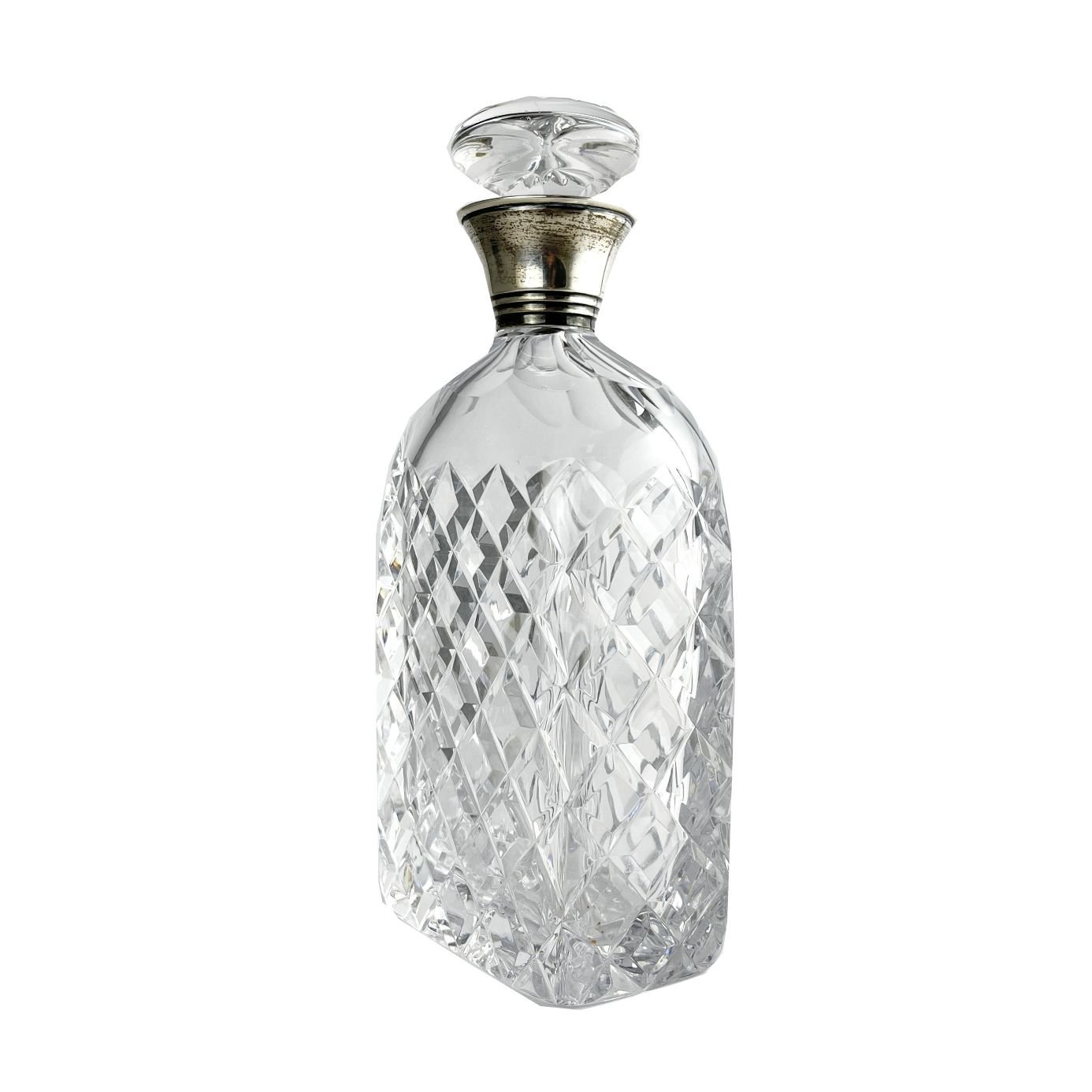 Botellón rectangular en cristal tallado. Virola en plata lisa. Alto 23 cm.