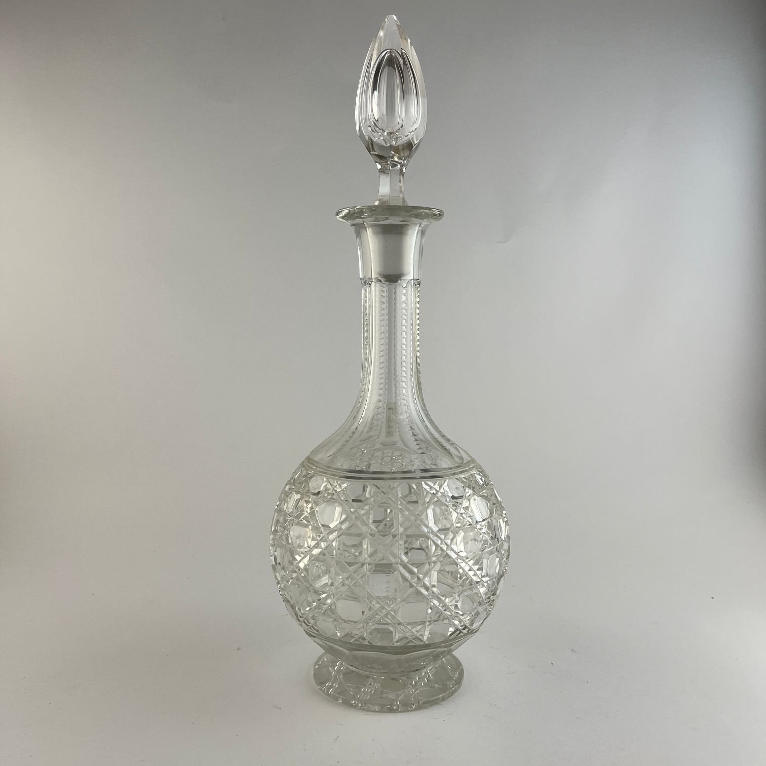 Botellón en cristal tallado y facetado, con tapón. Alto 35 cm.