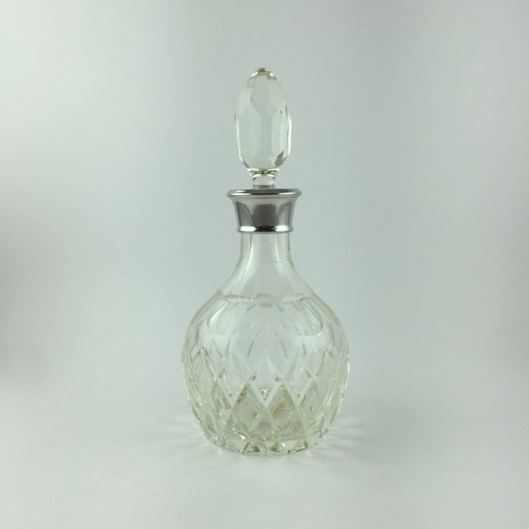 Botellón en cristal tallado con virola en metal plateado. Alto 30 cm.