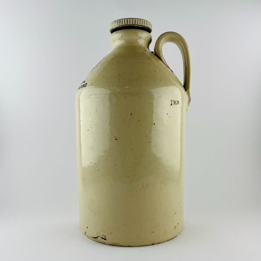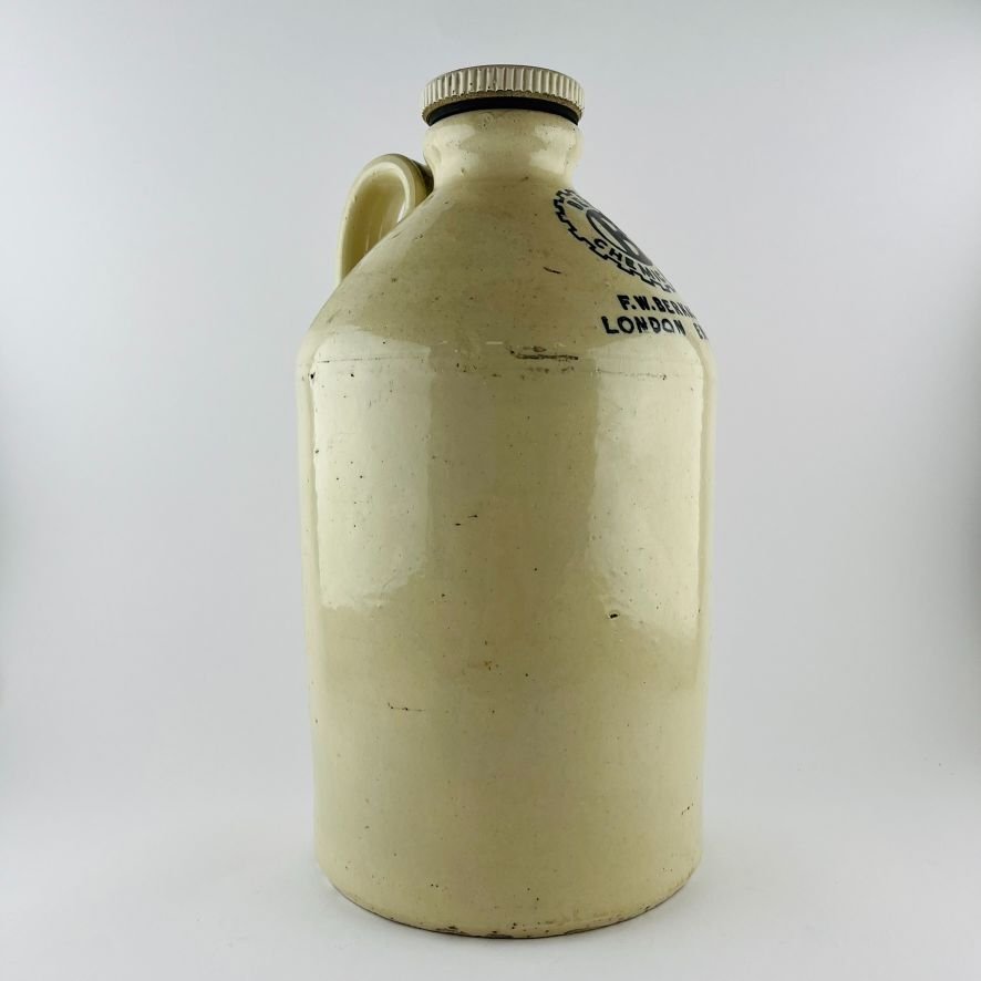 Botellón inglés de gres de un galón. Con tapón rosca en gres y asa, con inscripción estampada en negro. «Berk Chemicals. F.W. BERK and Co. Ltd. London. England.» Alto 35 cm.