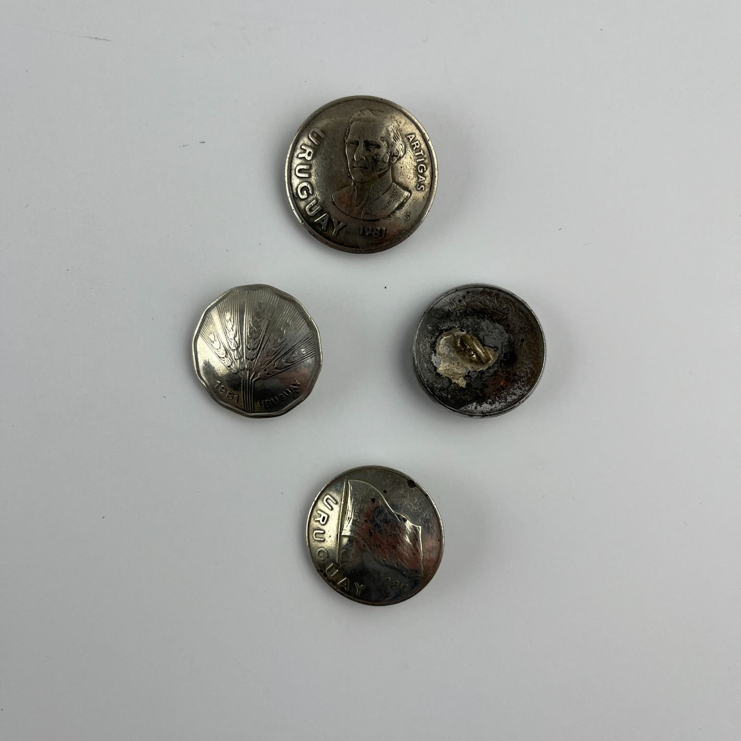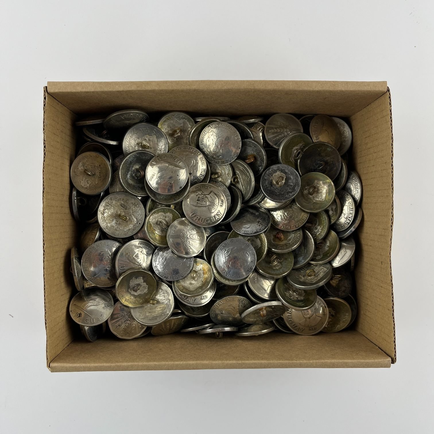 Conjunto de doscientos cincuenta botones gauchos realizados con monedas uruguayas década de 1980.