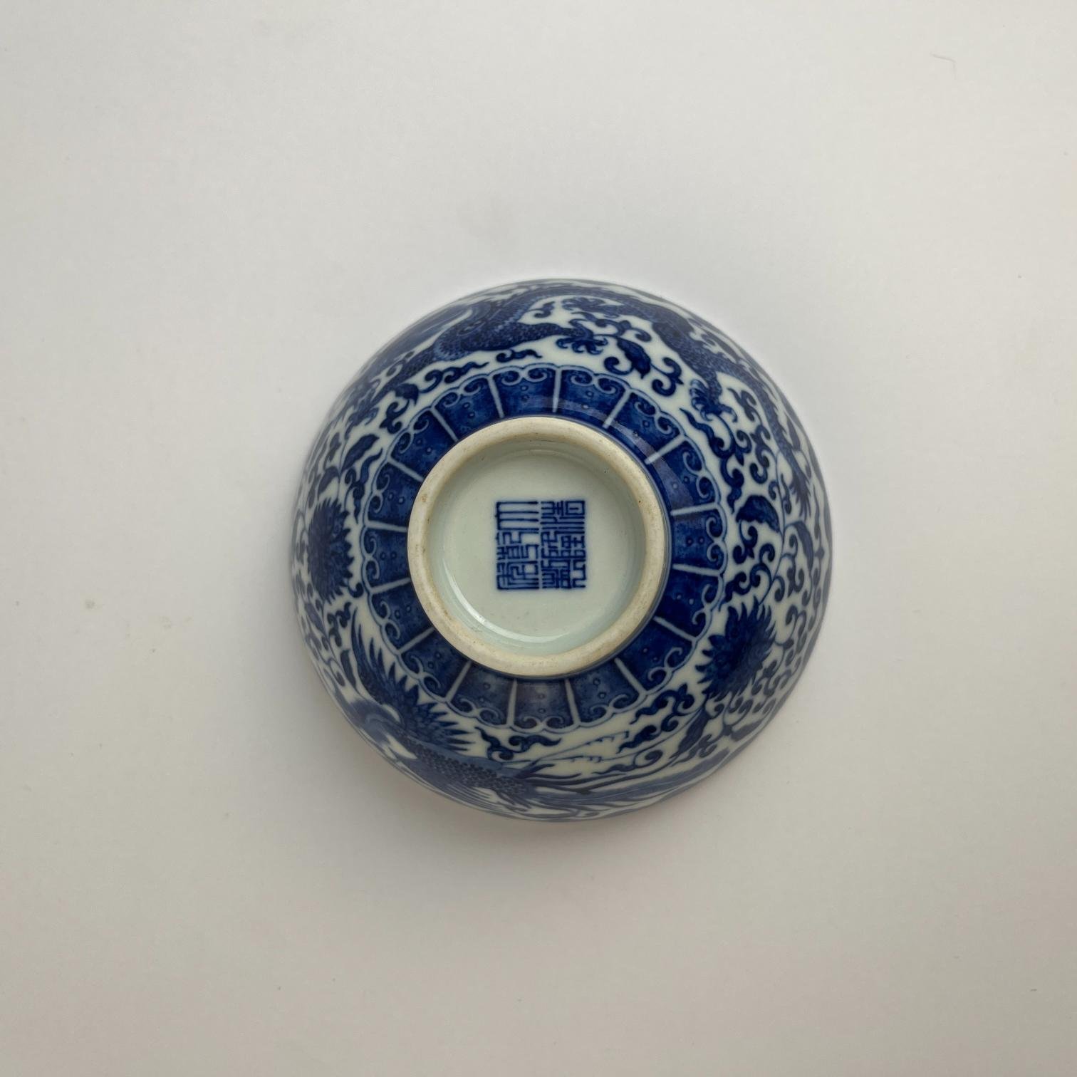 Pequeño bowl chino en porcelana azul y blanca decorada «dragón, flores de loto y ave fénix». Borde decorado con guarda ruyi. Base con sello del emperador Qianlong. 5 x 11 cm.