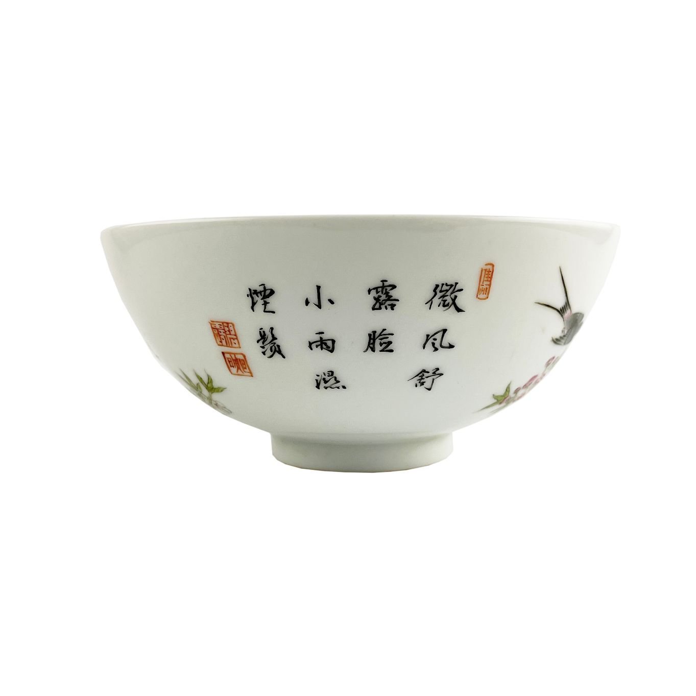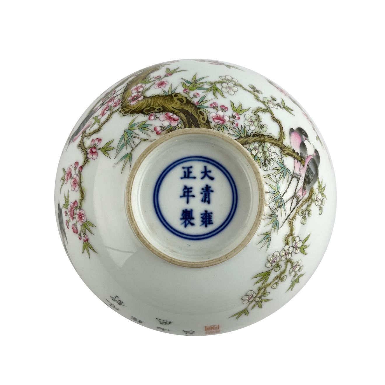 Bowl chino en porcelana familia rosa decorada «aves y cerezos» e «inscripción». Base con doble círculo y símbolos del emperador Yongzheng. 6.5 x 14 cm.
