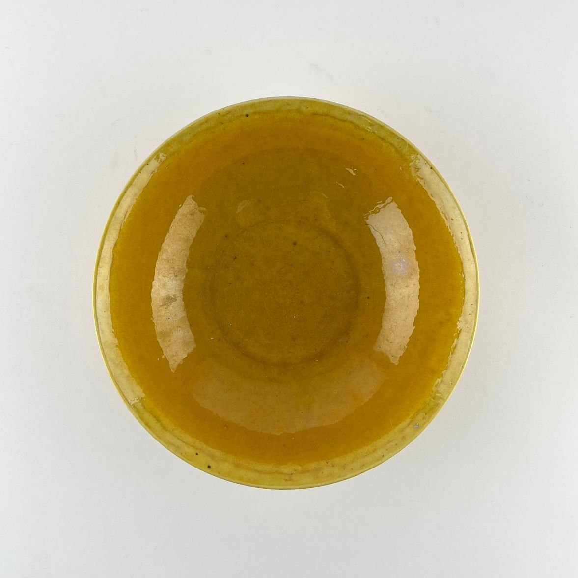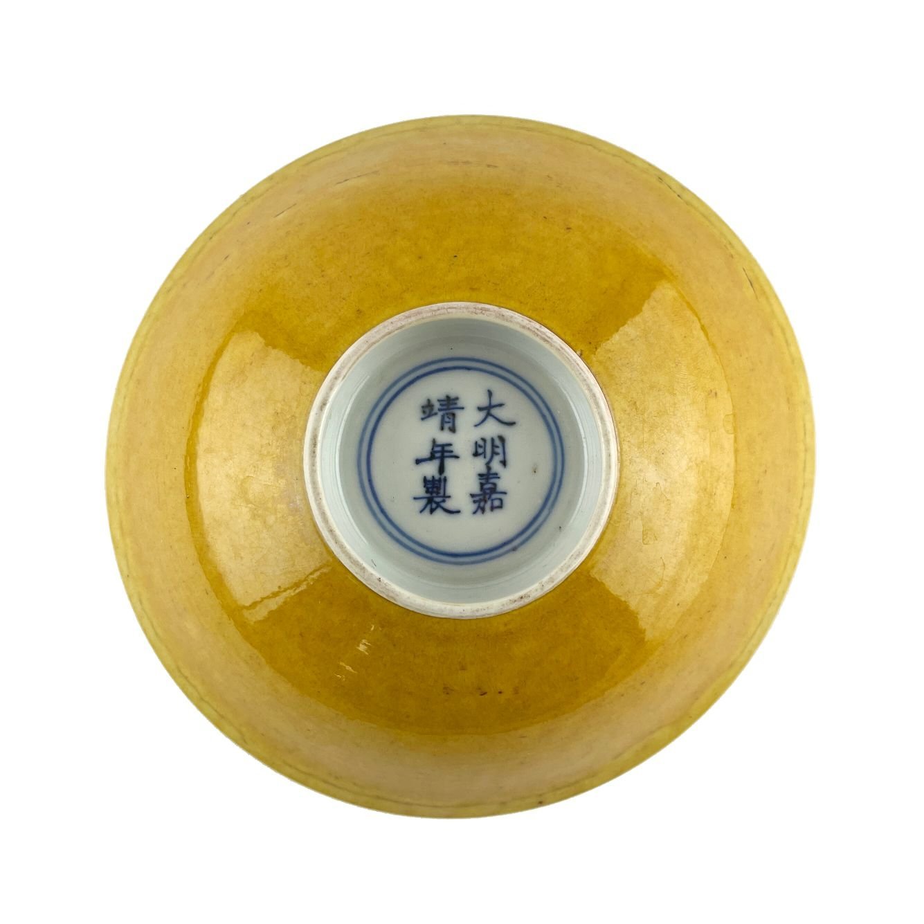 Bowl chino en porcelana vidriada en amarillo. Base con doble círculo y marcas del período Jiajing. 5 x 16 cm.