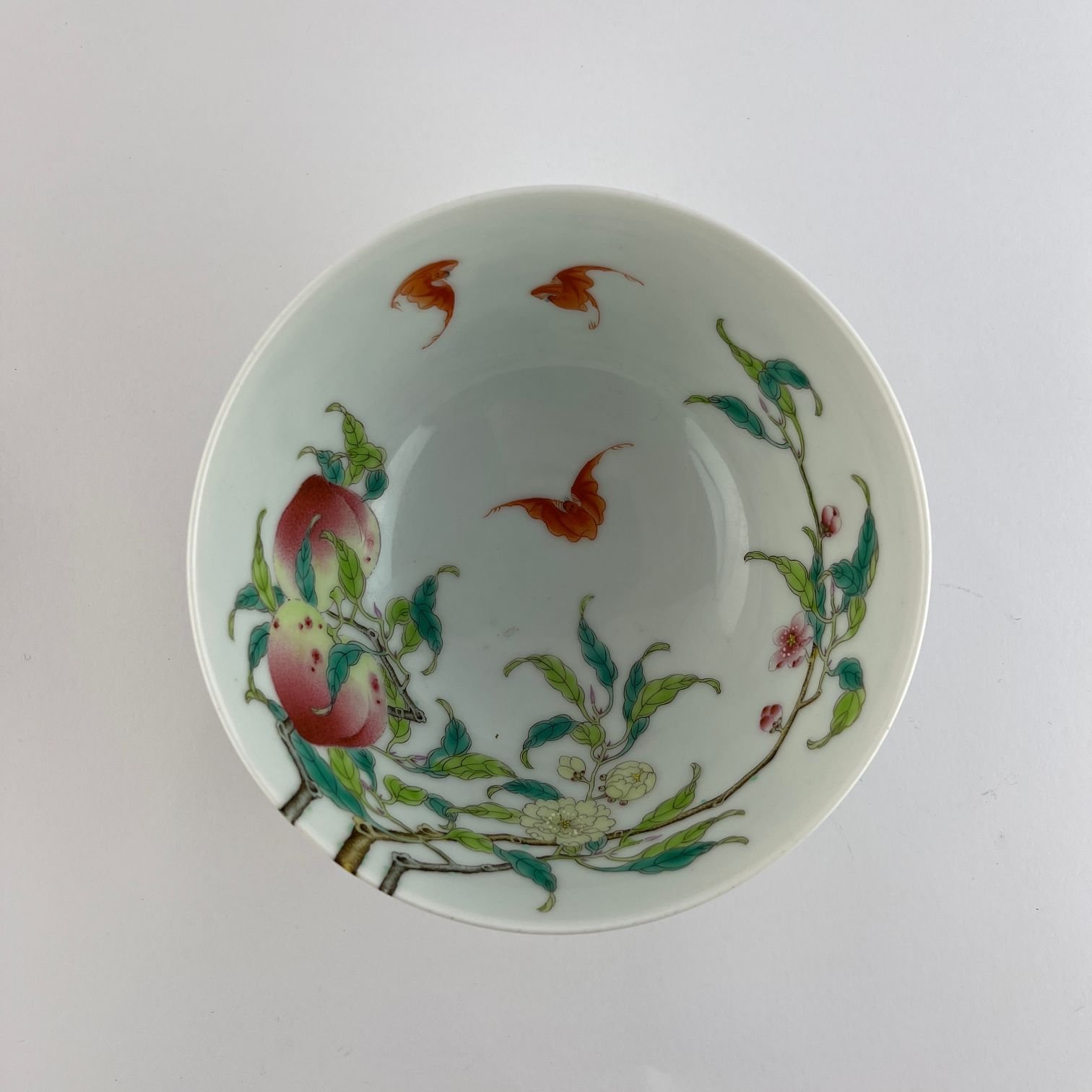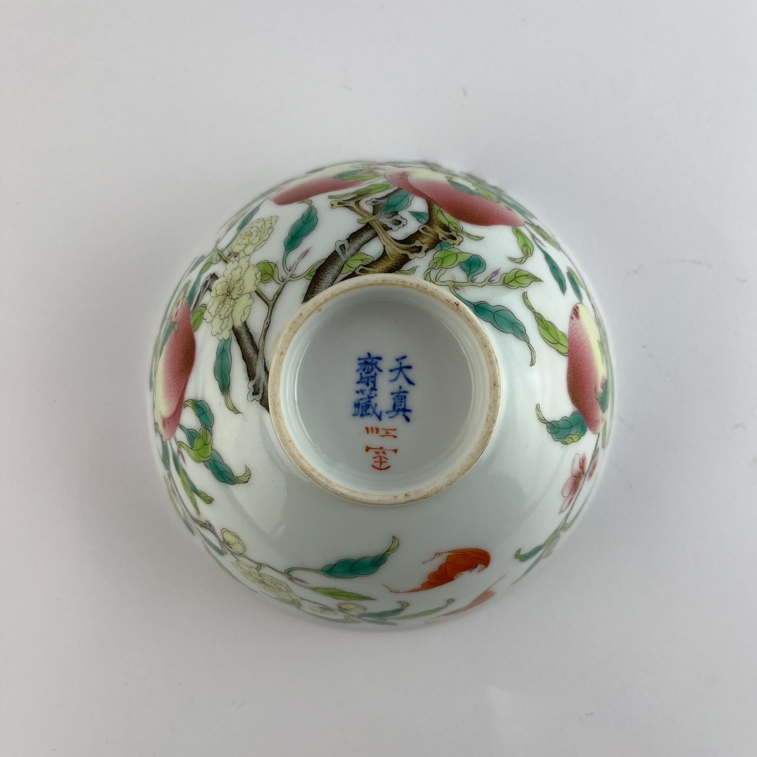 Bowl chino en porcelana familia rosa decorada «melocotones». Símbolos del período Qing en la base. 7 x 13.8 cm.