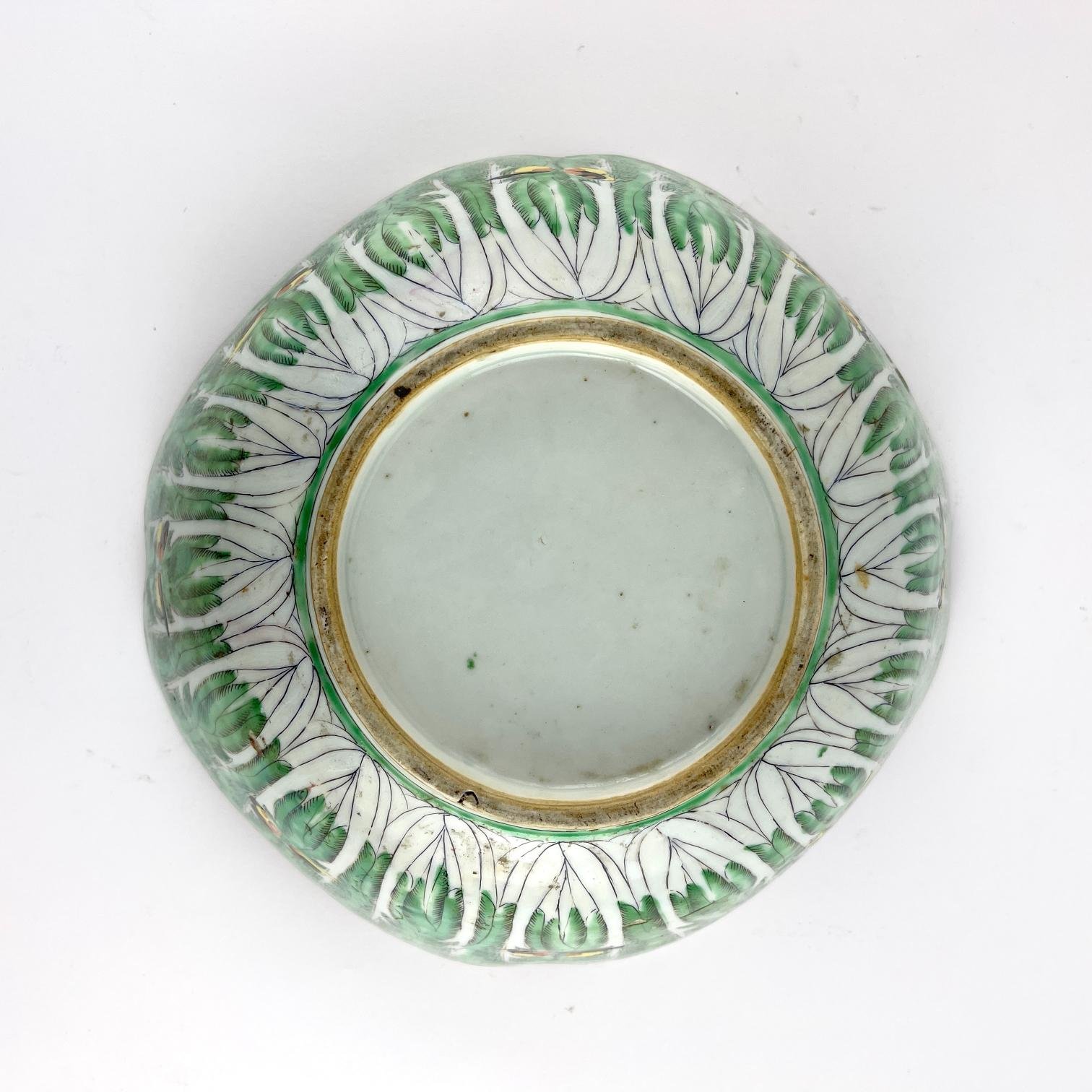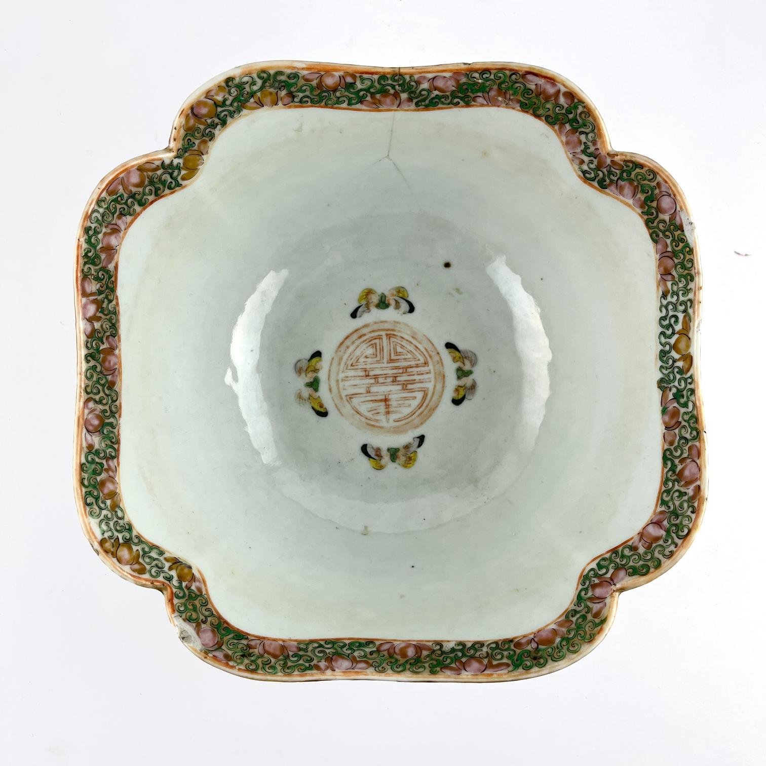 Bowl chino en porcelana familia rosa s. XIX decorado «apios y mariposas», con borde en ondas decorado con guarda al estilo Cantón y símbolo «Shou» de la longevidad. 11 x 14,5 x 14,5 cm. Presenta fisura en lateral.