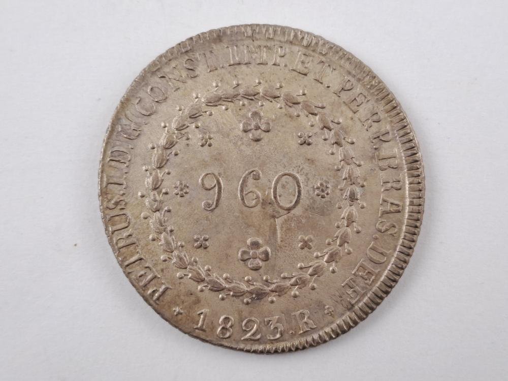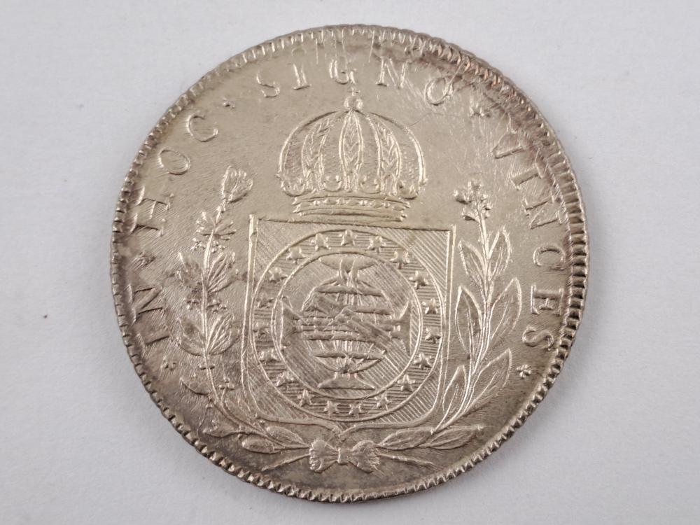 Moneda brasileña en plata denominación 960 reis del año 1823 R. Peso 26,72 gr. Presenta rastros de sobreacuñación.