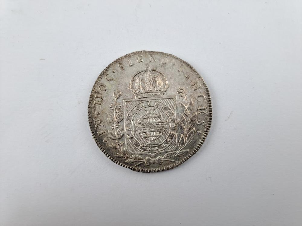 Moneda brasileña en plata denominación 960 reis del año 1824 R. Peso 26,85 gr. Presenta rastros de sobreacuñación.