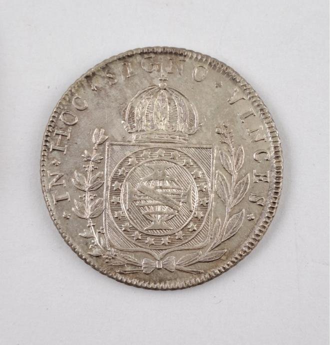 Moneda brasileña en plata denominación 960 reis del año 1825 R. Peso 26,65 gr. Presenta rastros de sobreacuñación.