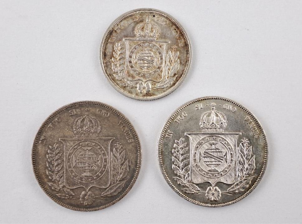 Tres monedas brasileñas en plata 900 denominaciones 1000 reis de los años 1859 y 1861 y 500 reis del año 1865.