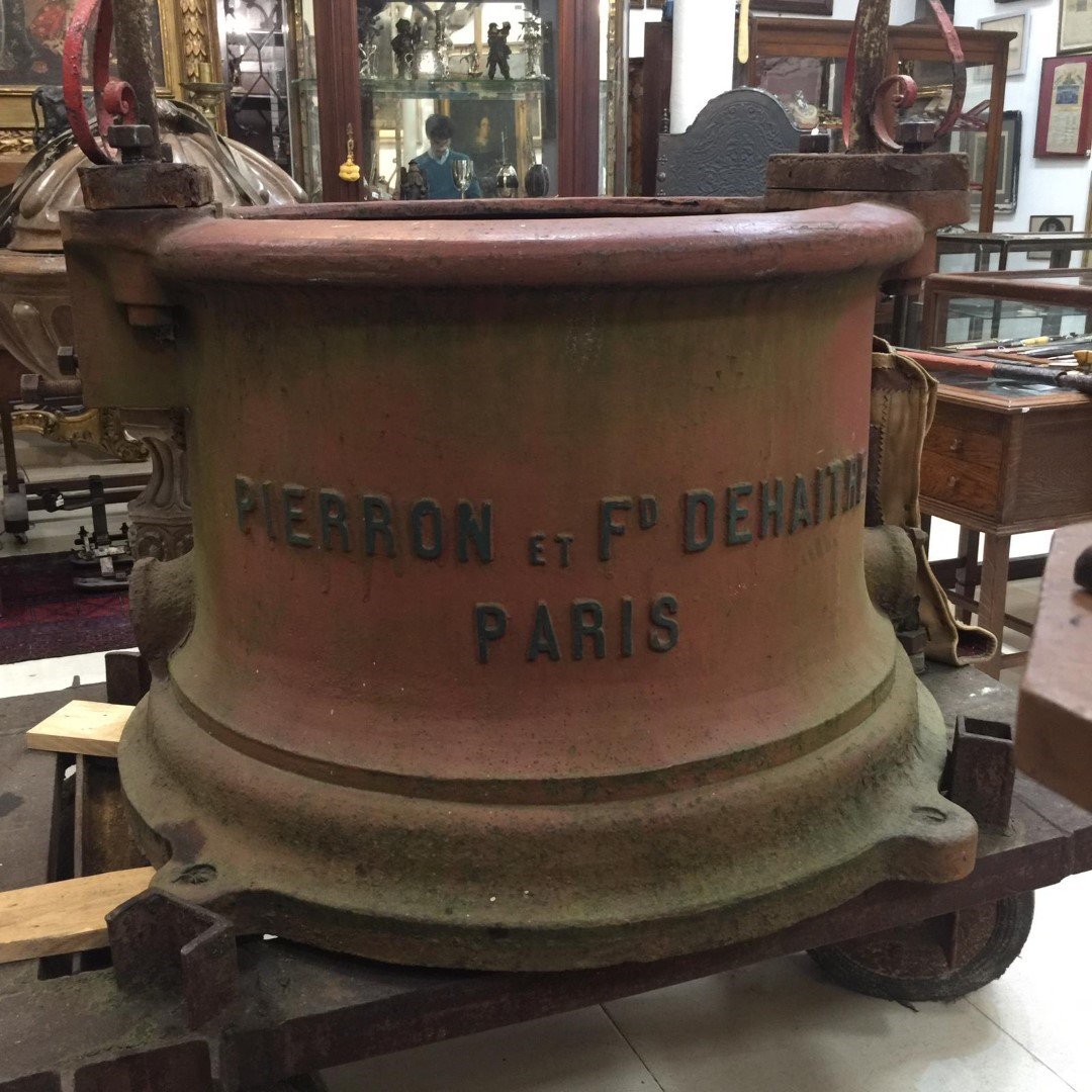Antiguo brocal de aljibe francés en hierro fundido con arco en hierro forjado fabricado por Pierron et Fd Dehaitere, Paris, industria que lograra el primer premio en la Exposición Universal de París en 1895. Alto total 315 cm. Diámetro 90 cm.
