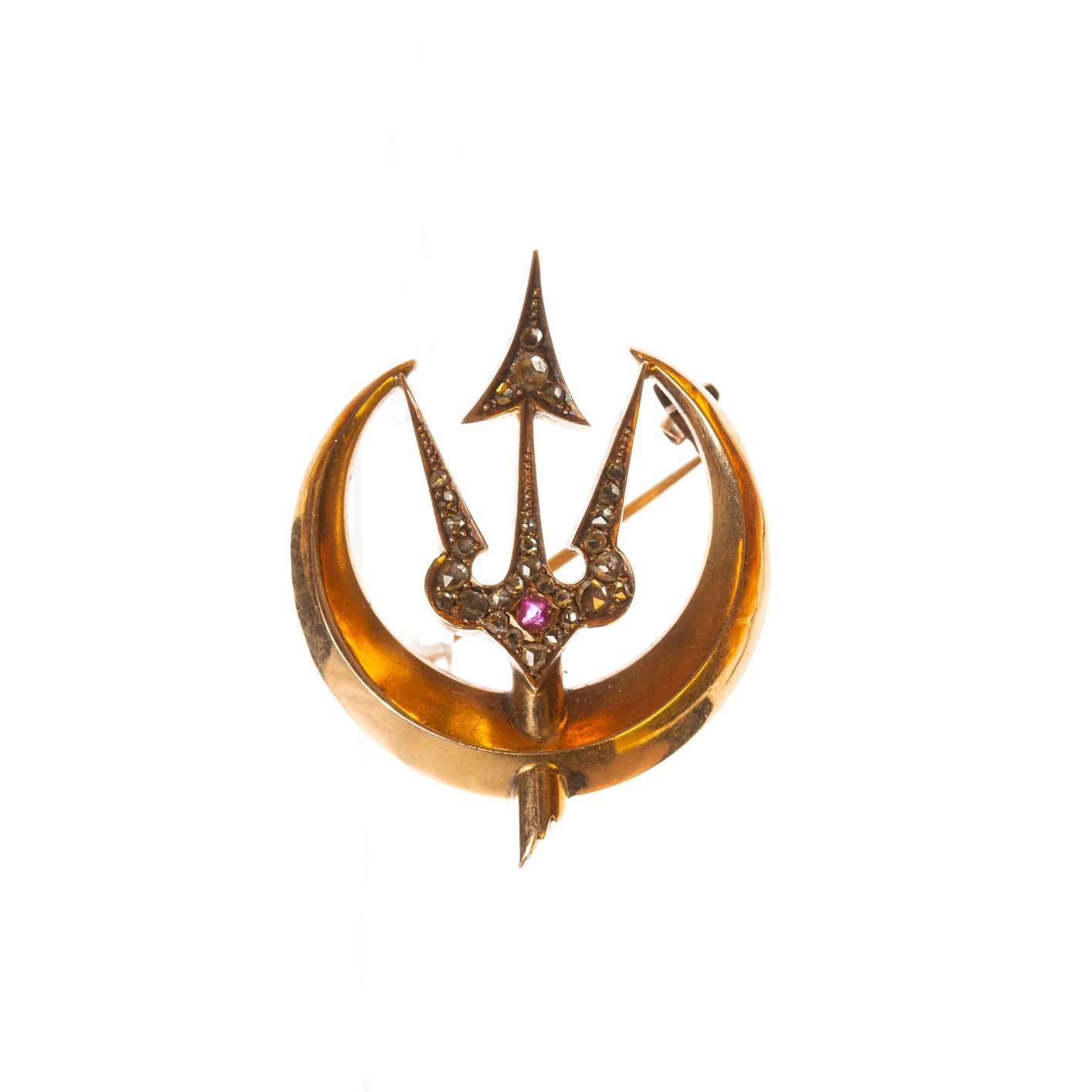Broche en oro amarillo esculturado en forma de tridente y medialuna, con diamantes y pequeño rubí. 36 x 28 mm. Peso bruto 6 gr.