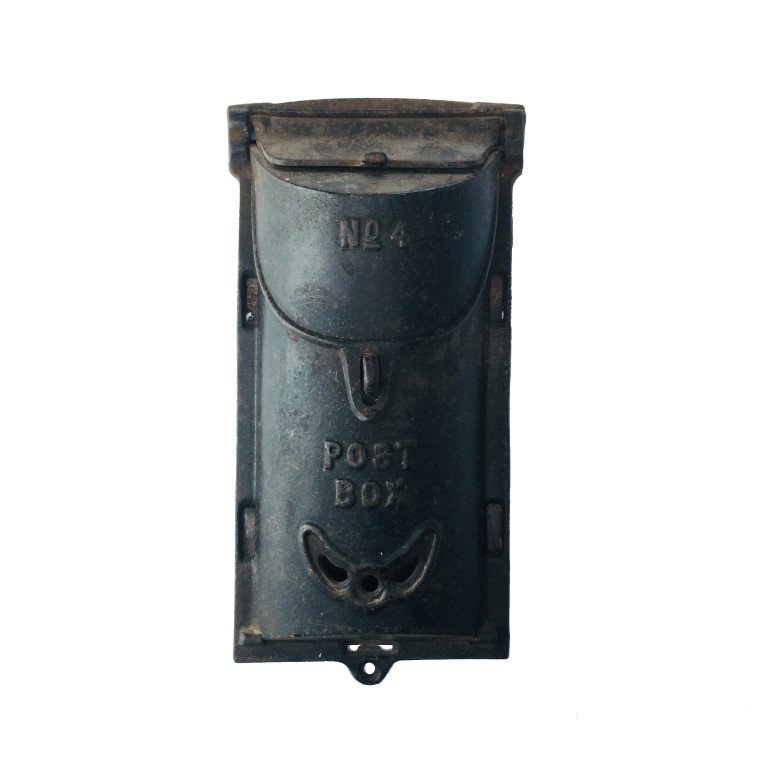 Antiguo buzón inglés en hierro fundido, con inscripción «Post Box No. 4».
