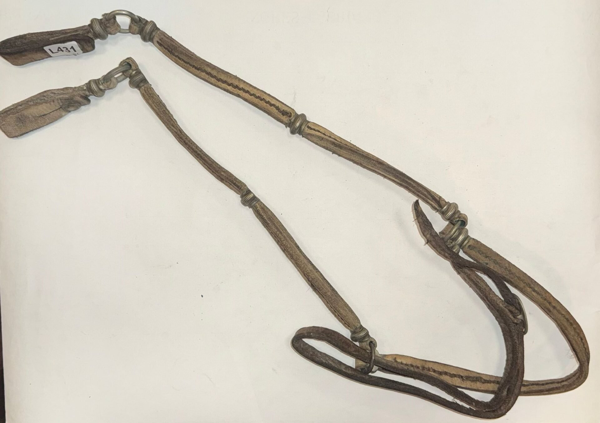 Cabezada de freno en cuero crudo con costuras en fino cuero, con pasadores y argollas en metal blanco.