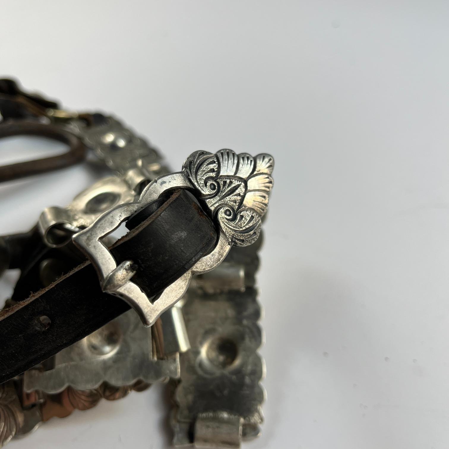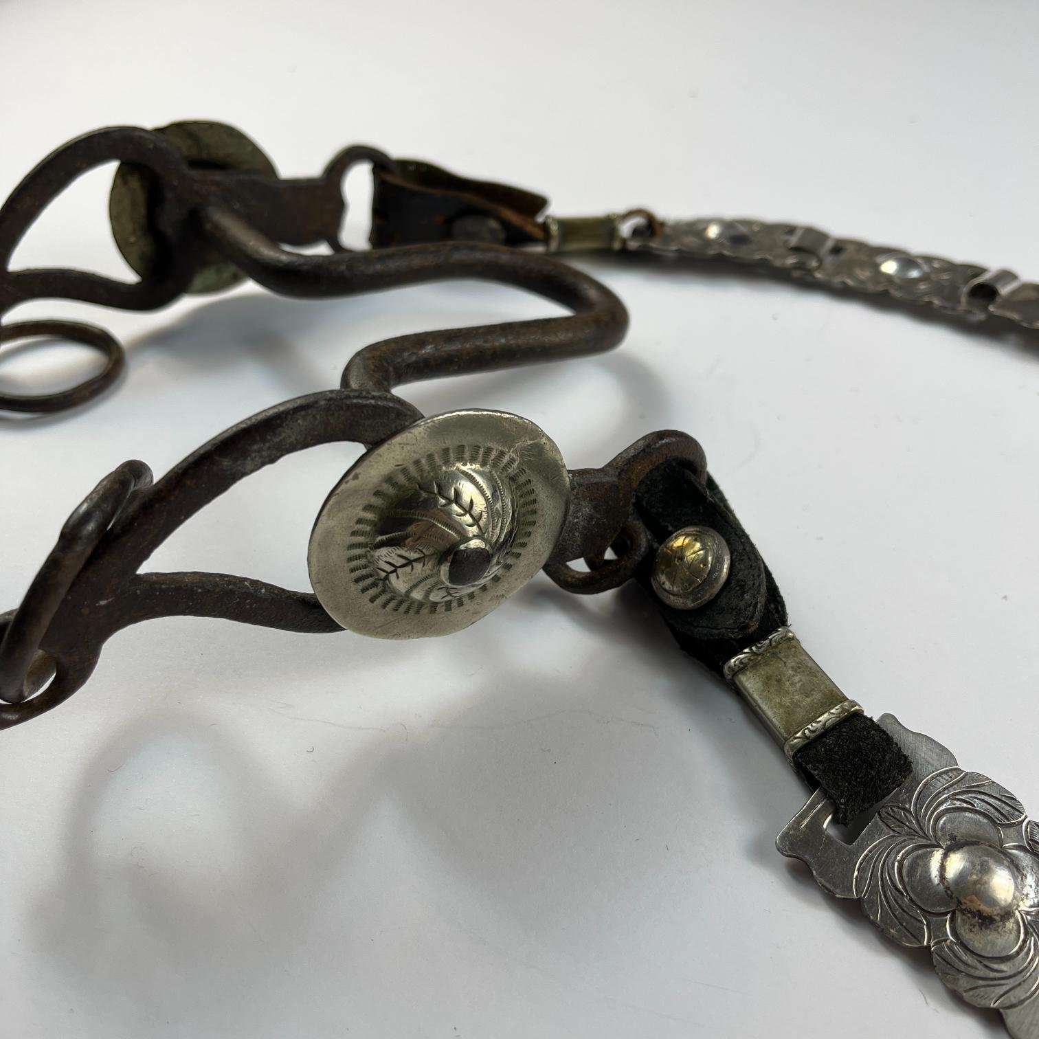 Cabezada de freno en placas de plata cincelada «hojas», con freno en hierro forjado y decorado con copas cinceladas «hojas». Diámetro 4 cm.