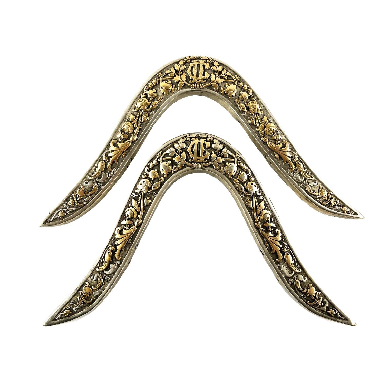 Par de cabezadas de recado tipo sirigote en plata y oro cinceladas «hojas y flores», con iniciales «C.U.» en oro.