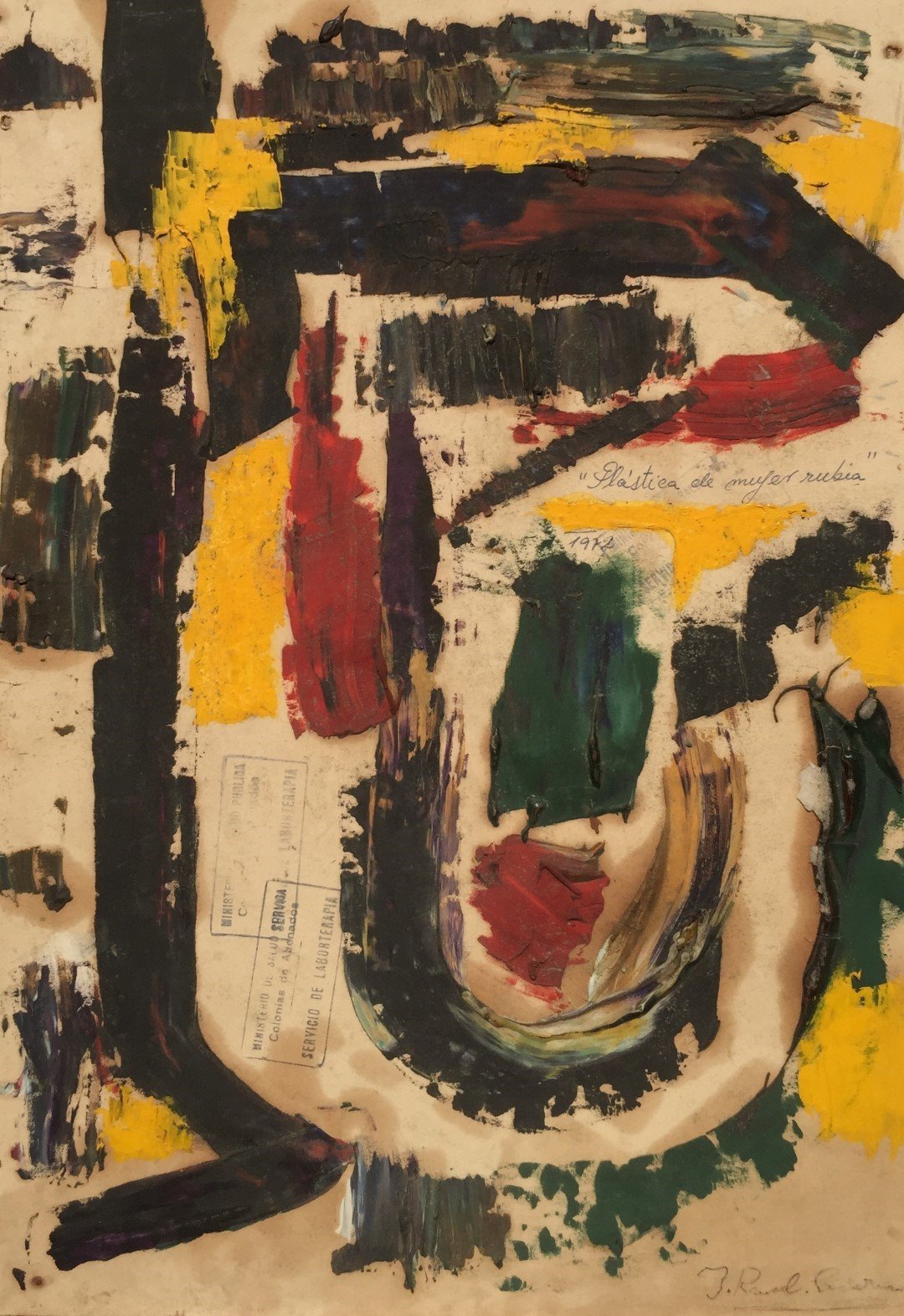 CABRERA, Raúl Javiel (escuela uruguaya, 1919-1992). Óleo sobre cartón. «Plástica de mujer rubia.» Firmado abajo a la derecha. Titulado y fechado «1972» al medio a la derecha. 40 x 28 cm.