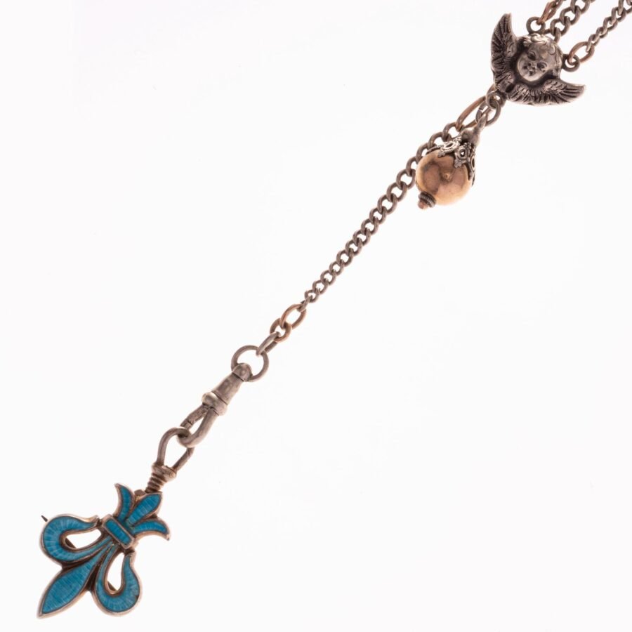 Cadena para reloj de bolsillo en eslabones de plata y oro, con prendedor esculturado «flor de lis» en esmalte y colgante en plata esculturado «cara de ángel.»
