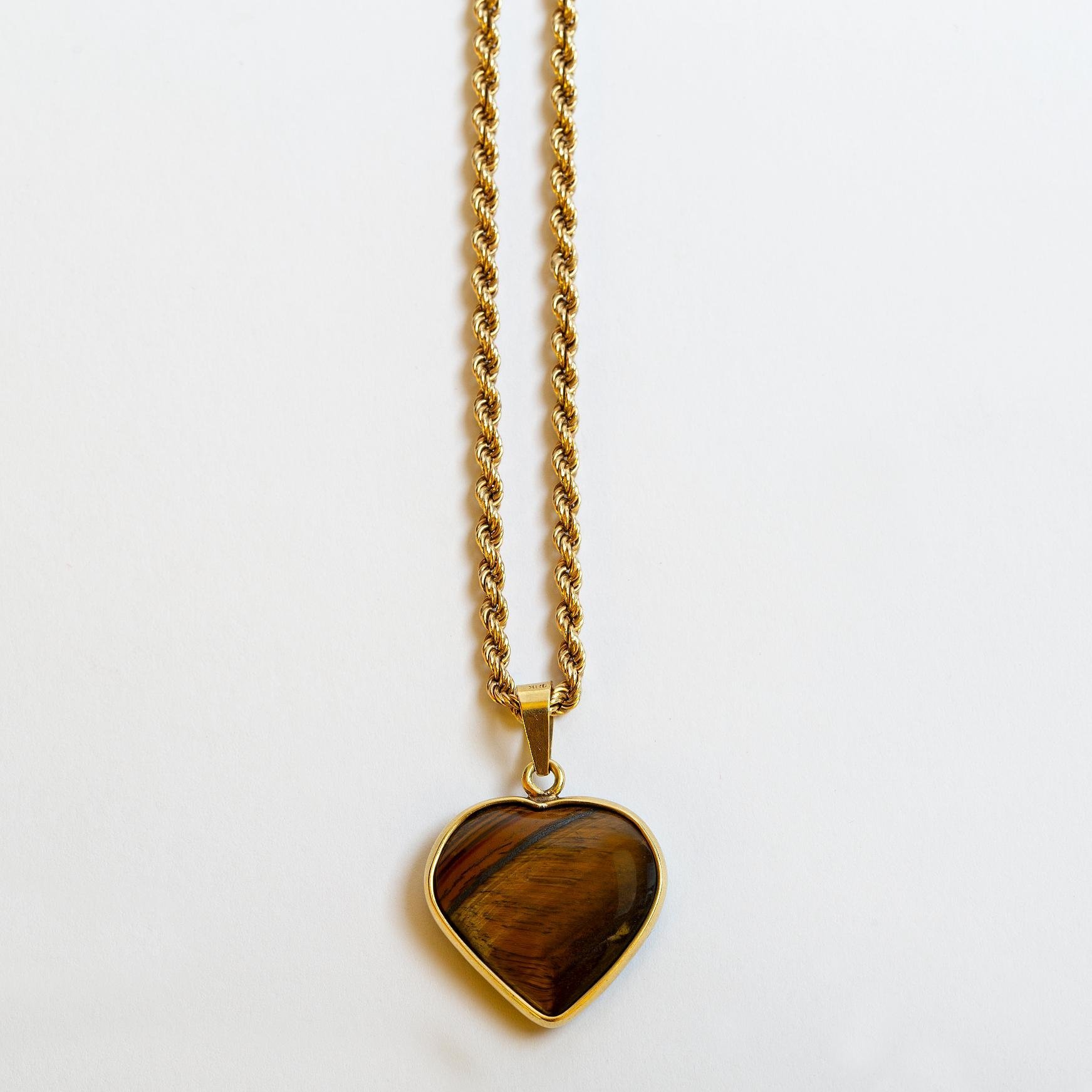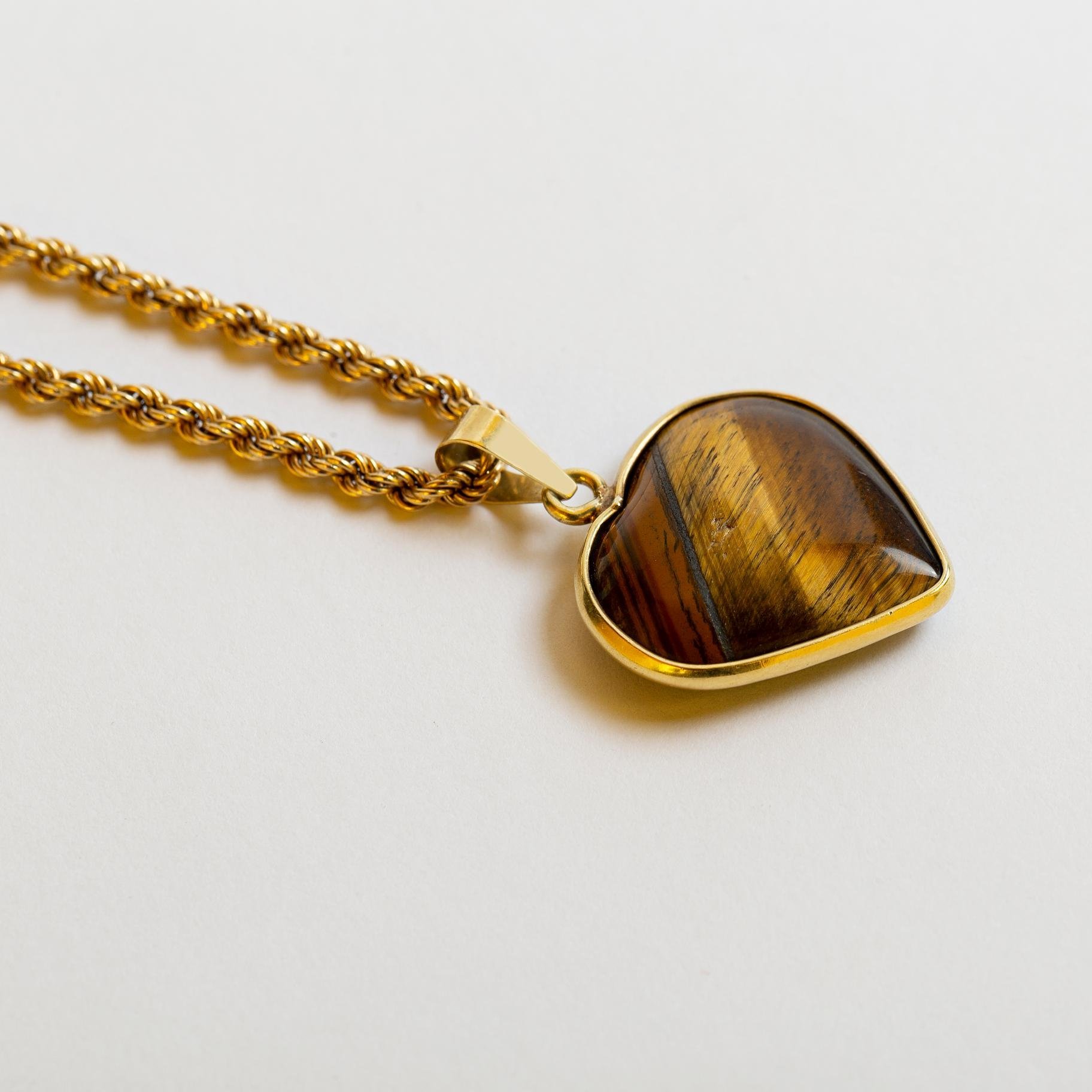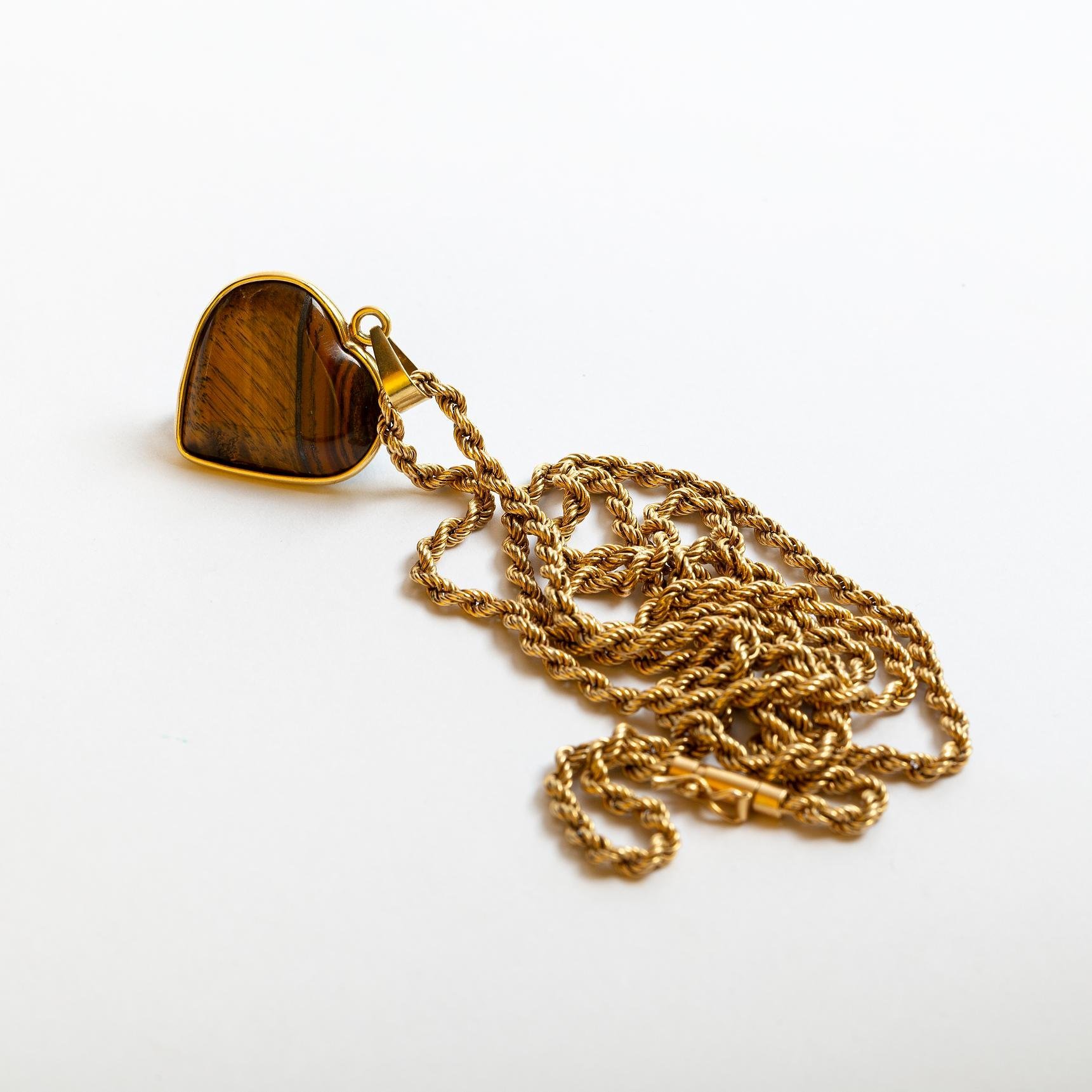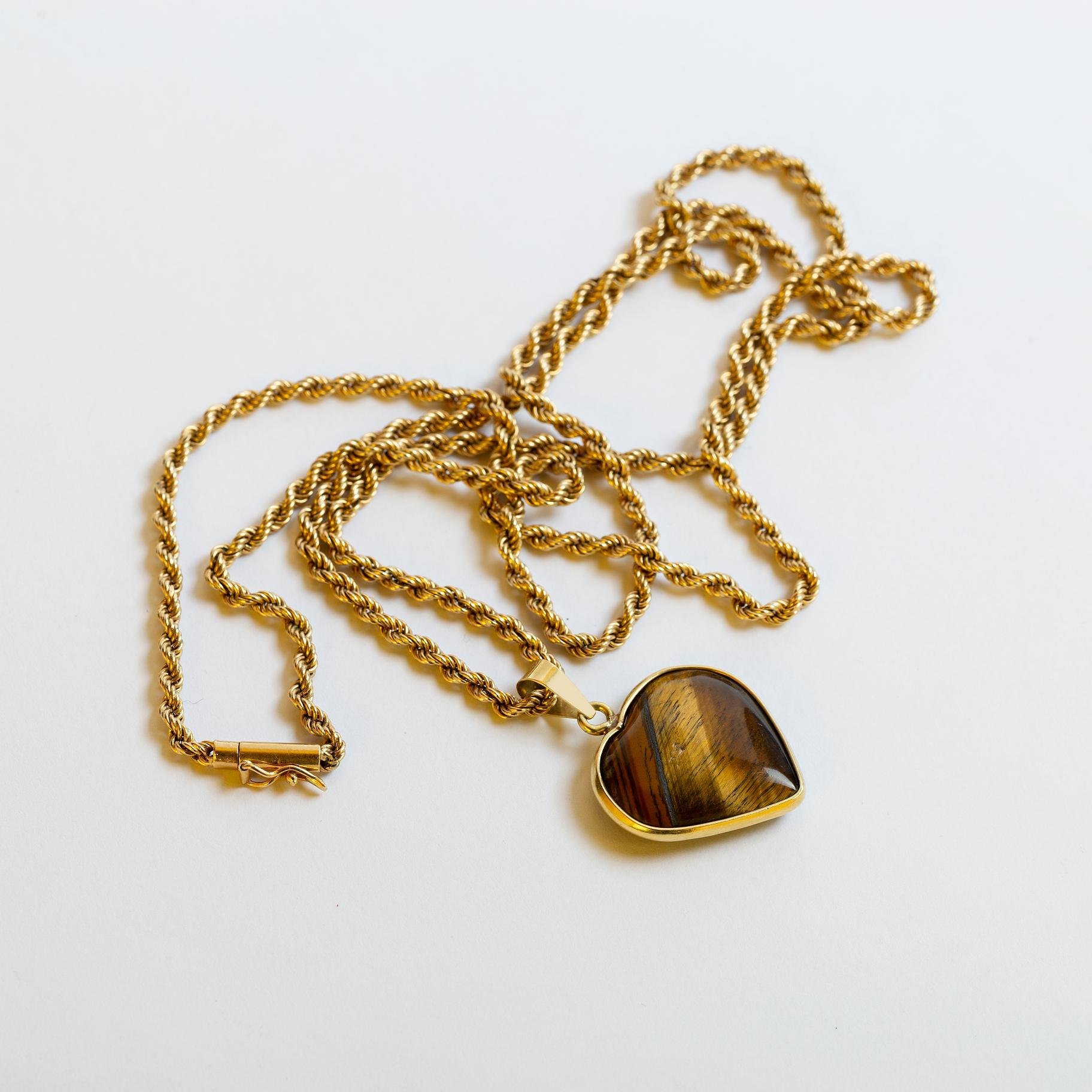 Cadena tourbillon en oro 18 K amarillo. Largo 73 cm. Diámetro 2 mm. Con colgante en ojo de tigre tallado «corazón» con marco en oro 18 K amarillo. Peso bruto total 15.8 gr.
