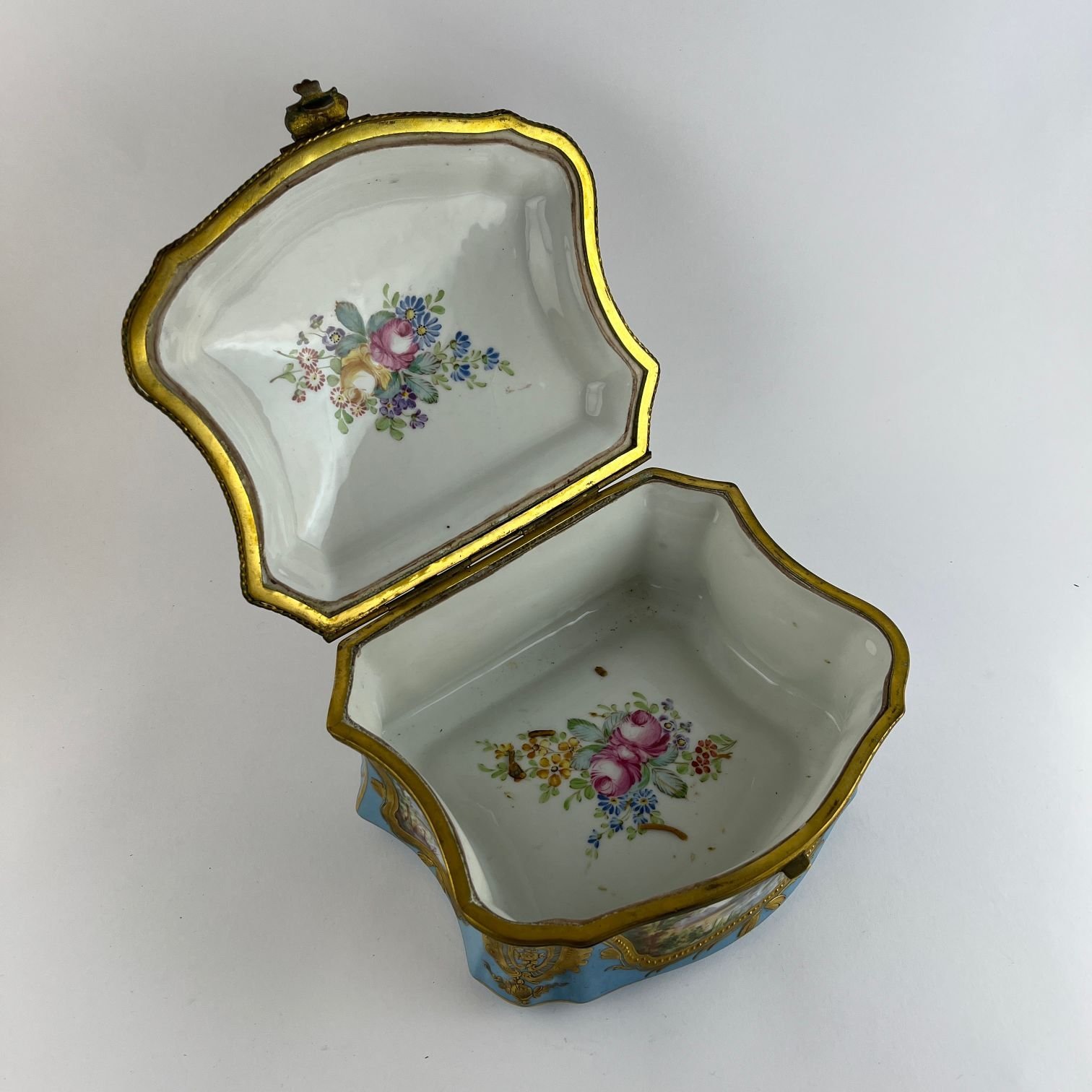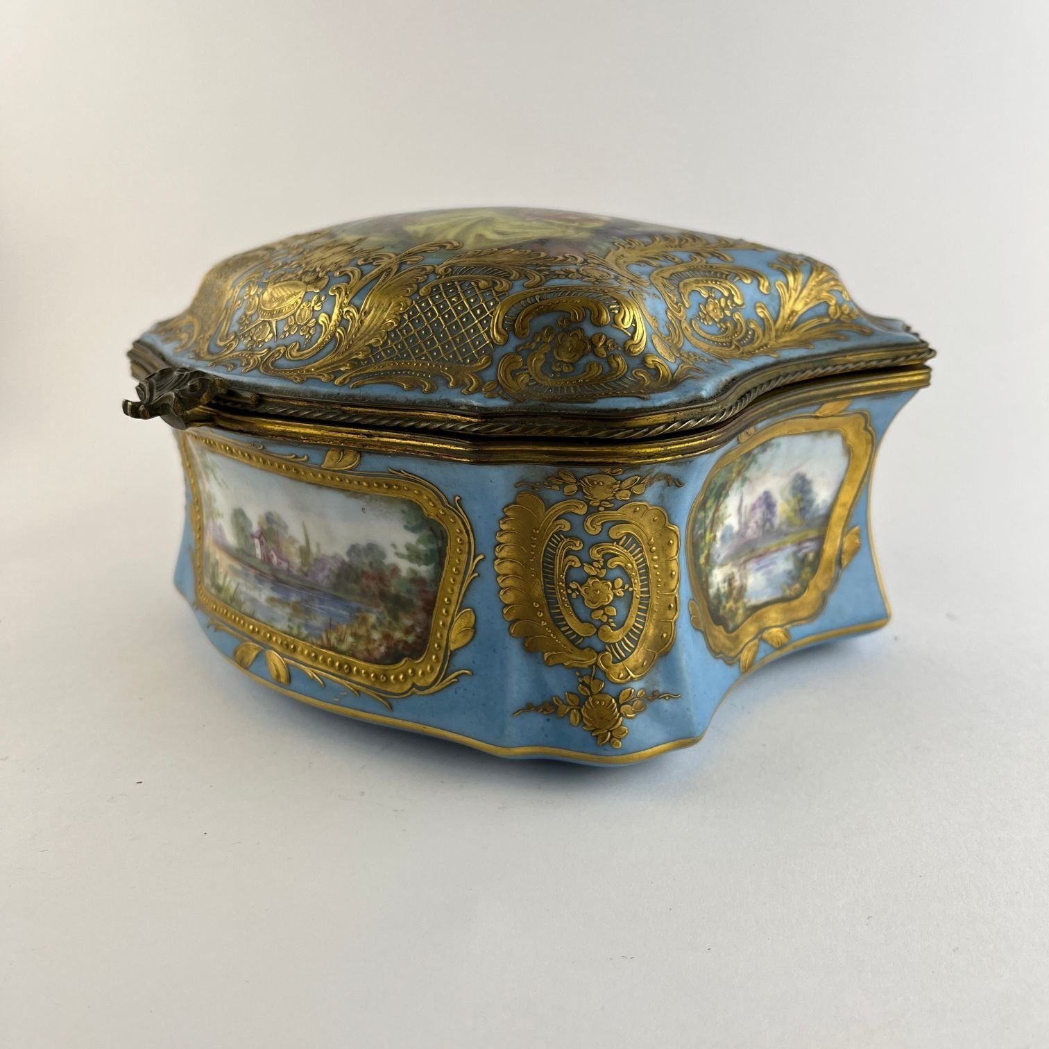 Caja alhajera francesa en porcelana estilo Sèvres color celeste pintada a mano «escena galante» y «paisajes», con destaques en dorado. 12 x 20 x 17 cm.