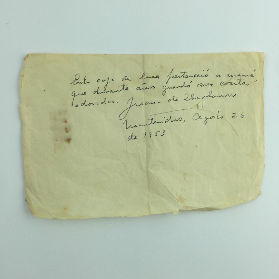 Caja china en madera laqueada color anaranjado con monturas en bronce. Acompañada por nota manuscrita por Juana de Ibarbourou, fechada en Montevideo el 26 de agosto de 1953. «Esta caja de laca perteneció a mamá, que durante años guardó sus cositas adoradas.» 10 x 24 x 15 cm.