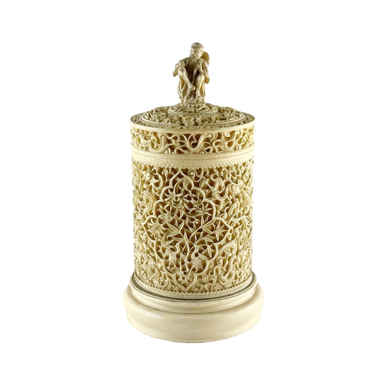 Caja cilíndrica china en marfil cantonés tallado «dragones, aves y flores», con pomo de tapa esculturado «anciano». 13 x 25 cm. Pequeña avería en tapa.