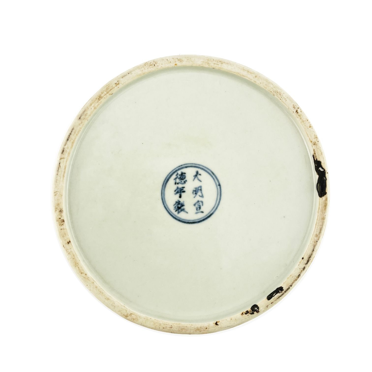 Caja cilíndrica china en porcelana azul y blanca decorada «aves fénix y flores de loto». Base con doble círculo y símbolos del emperador Xuande. 9 x 18 cm.