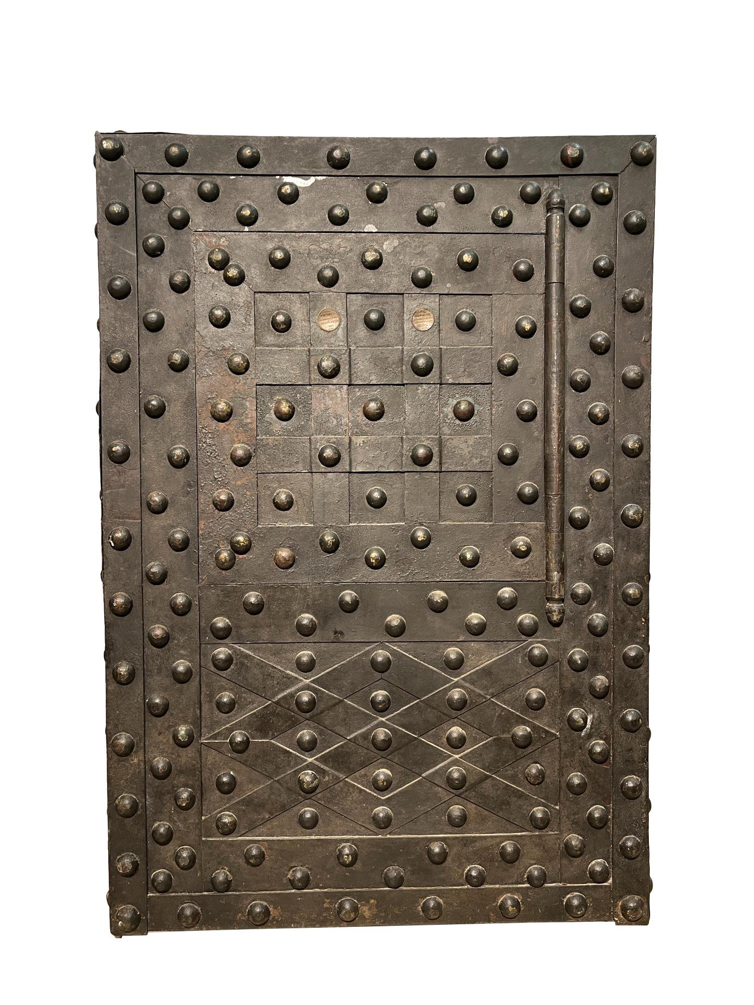 Caja fuerte francesa s. XIX en tiras de hierro con remaches. Una puerta con tres cerraduras combinadas y ocultas. Con llave. Funcionando. 150 x 103 x 70 cm.