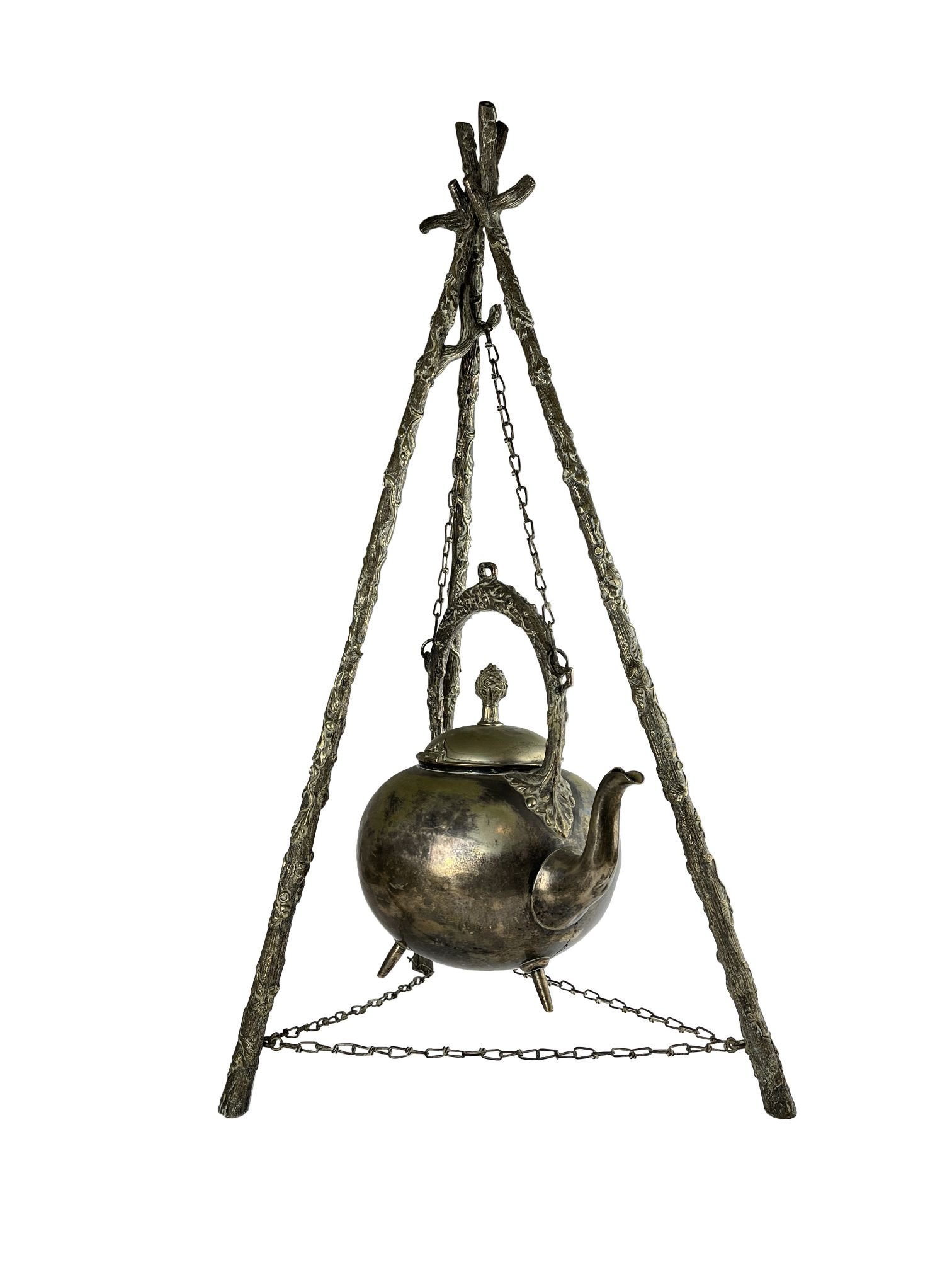 Caldera inglesa con trípode, en metal plateado cincelado «vides». Caldera grabada con iniciales «C.E.P.». Alto de trípode 59 cm.