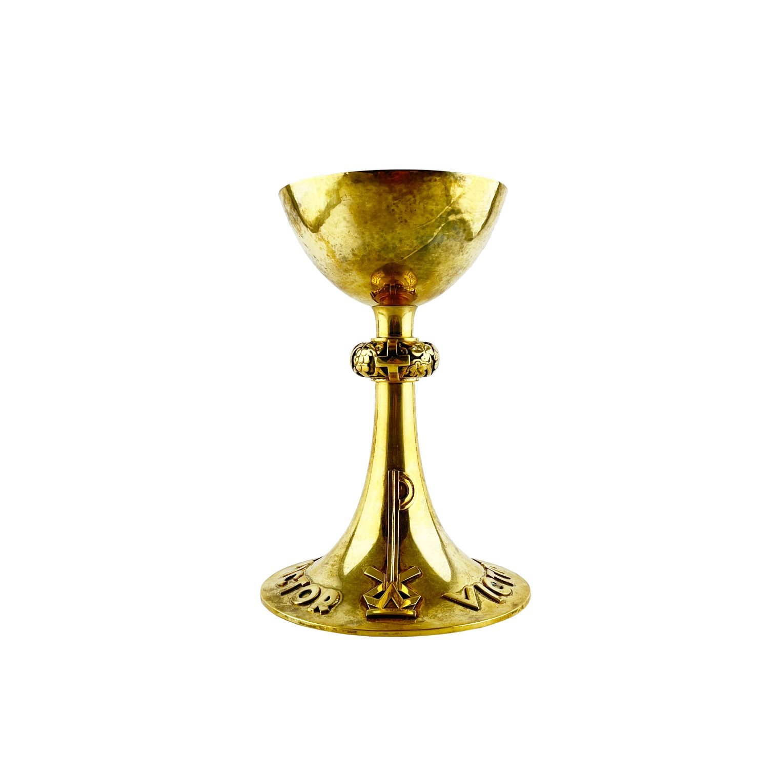 Cáliz alemán art decó en plata vermeil con guarda decorada «vides y cruz» e inscripción «Victor Victima» y dedicatoria grabada. Realizado por el orfebre Bernd Cassau, Paderborn. 20.5 x 14 cm.