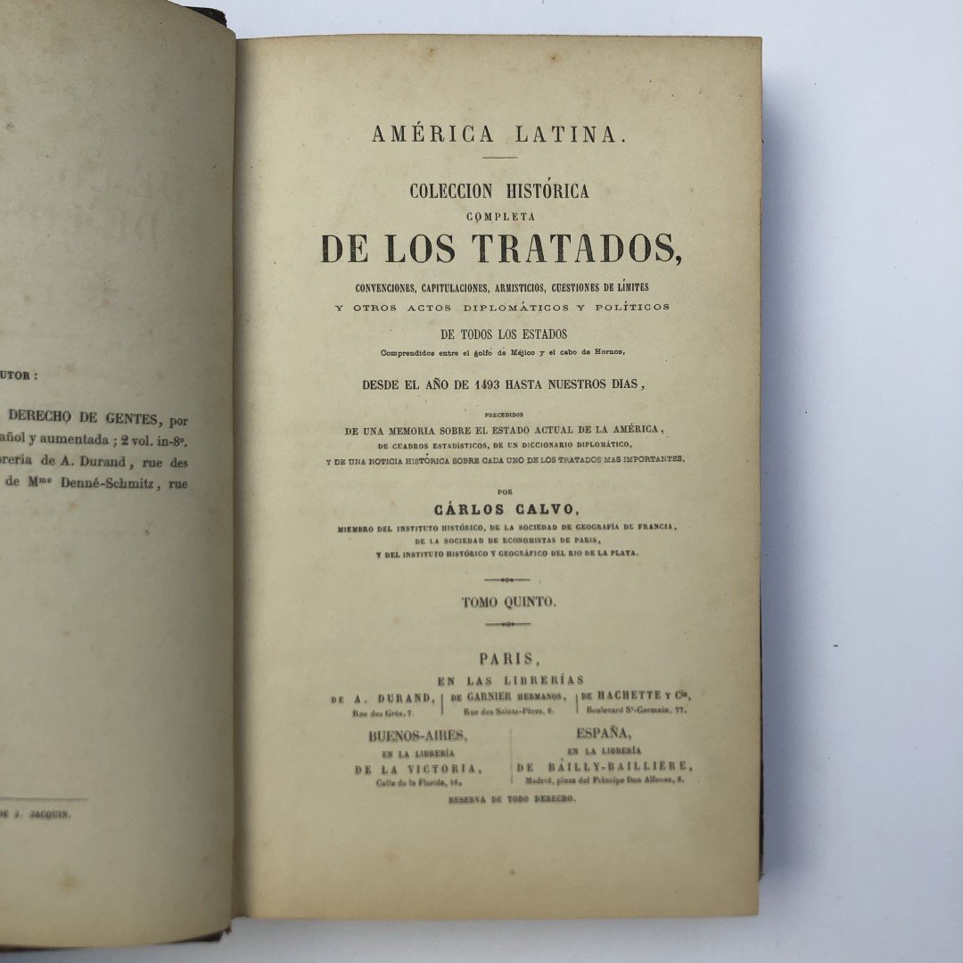 CALVO, Carlos: Colección completa de los tratados, convenciones, capitulaciones, armisticios y otros actos diplomáticos de todos los Estados de la América Latina (…). París, imprenta de J. Jacquin. 1862. Seis tomos. Encuadernación con lomo de cuero.