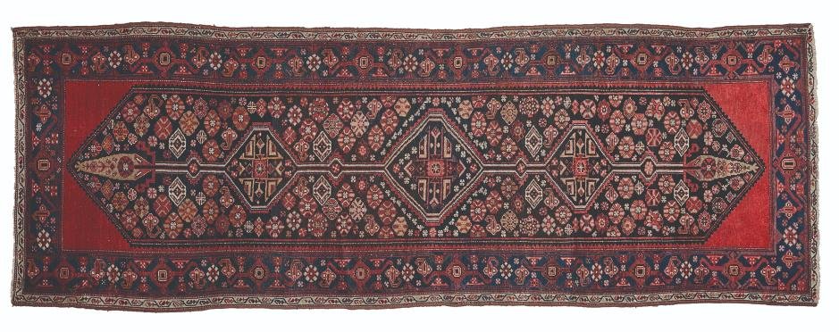 Caminero caucásico con decoración geométrica en varios colores sobre fondo color bordeaux y negro. 295 x 105 cm.