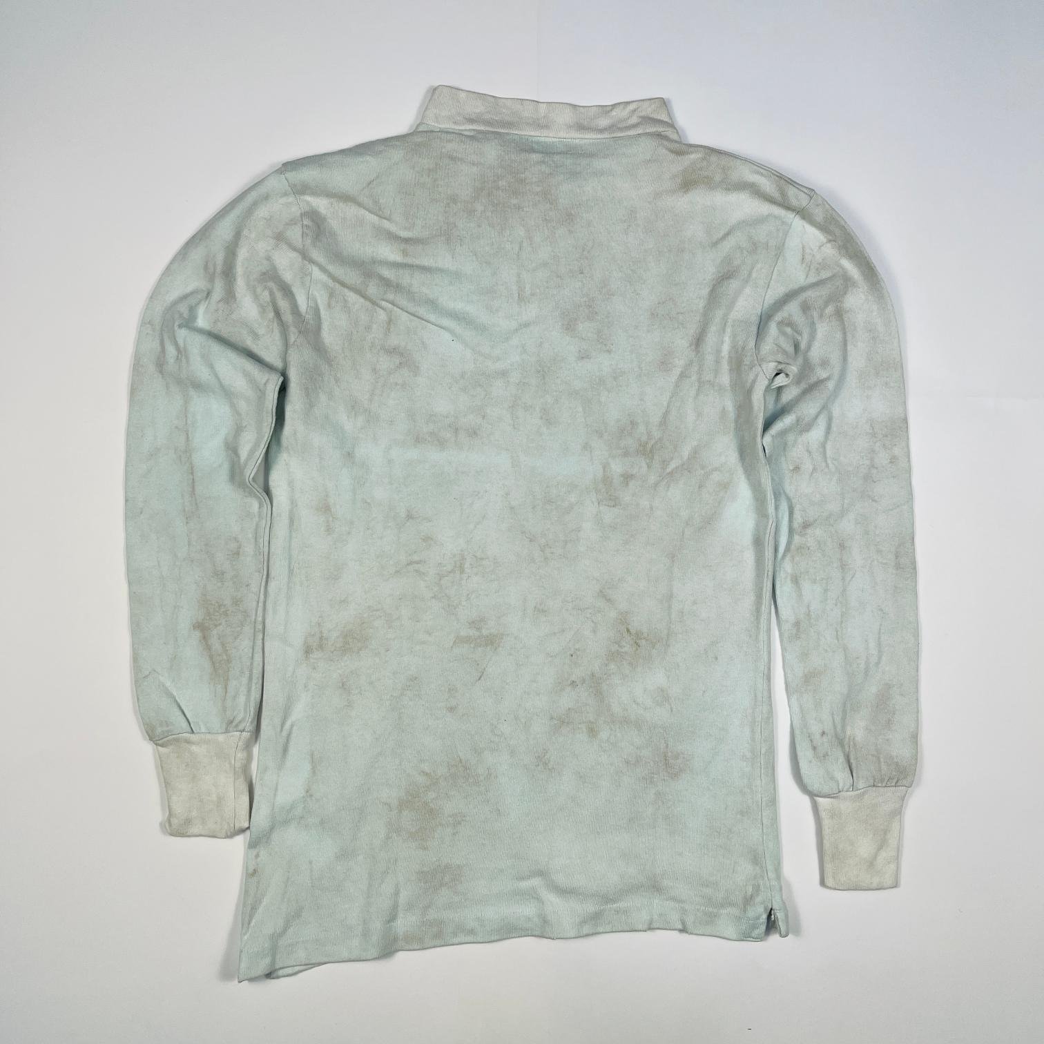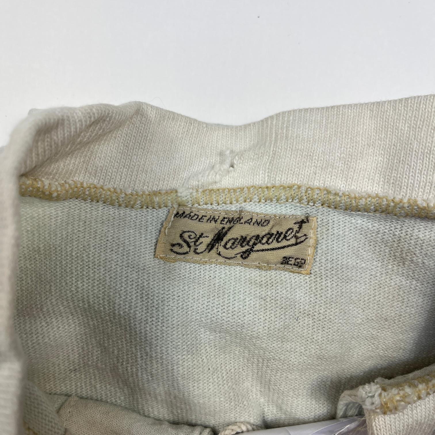 Esta legendaria e icónica camiseta, de la que se conocen muy pocos ejemplares, presenta las características típicas de la marca St. Margaret, con su costura tipo tubo y una única costura desde la axila hasta la parte inferior, reforzada para resistir la ruda naturaleza del juego futbolístico de la época.
