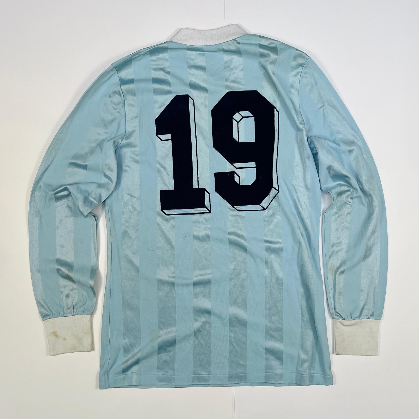 Camiseta de la Selección Uruguaya de Fútbol perteneciente al jugador Carlos “Pato” Aguilera, número 19, año, 1986, marca Le Coq Sportif, utilizada en el partido amistoso disputado con la Selección Irlandesa el 23 de abril de 1986 en la ciudad de Dublín.