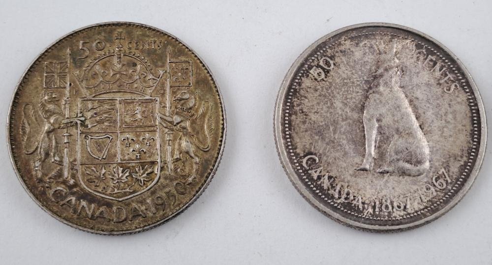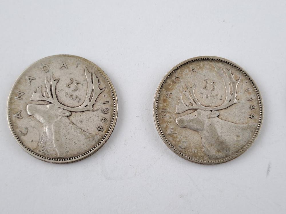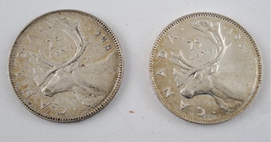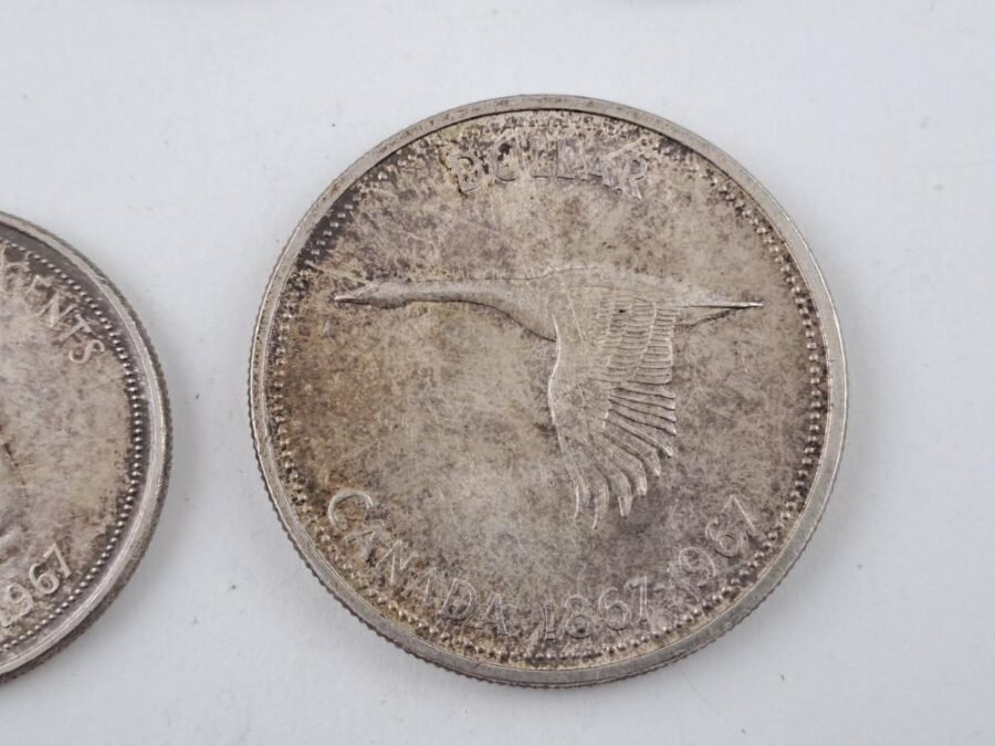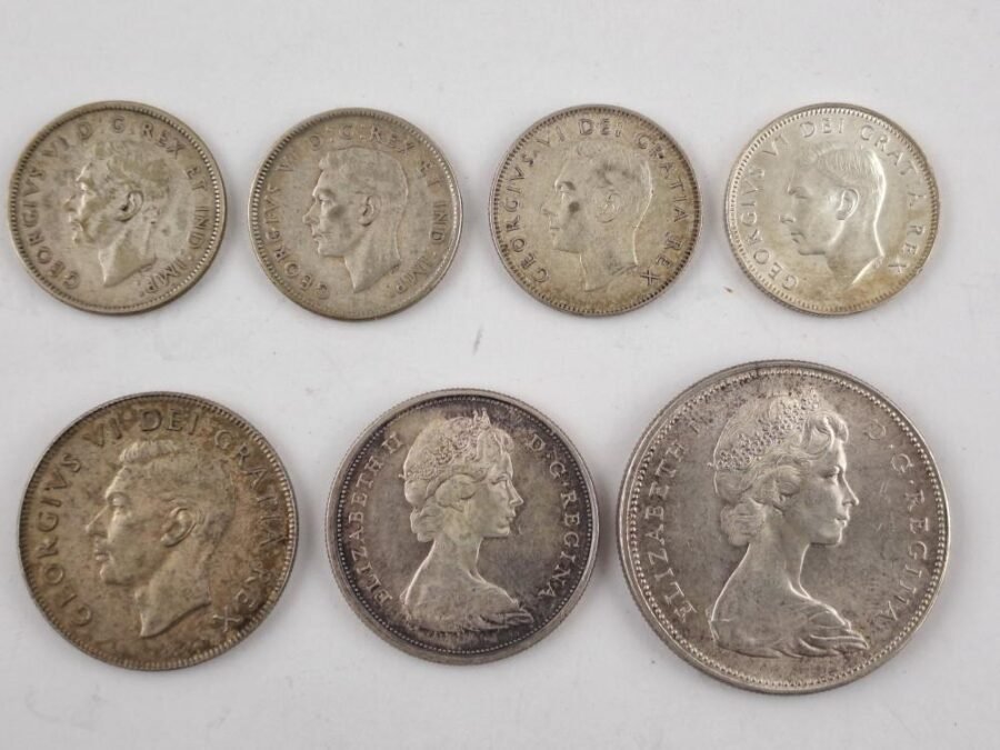 Siete monedas canadienses en plata 800: dos de ellas conmemorativas del centenario de Canadá, denominaciones 50 centésimos y un dólar del año 1967; otra de 50 centavos del año 1950; cuatro de 25 centavos, dos de ellas de 1944, otra de 1948 y otra de 1951.