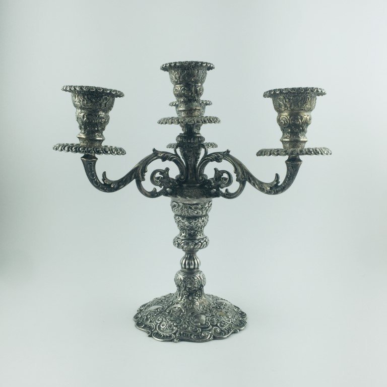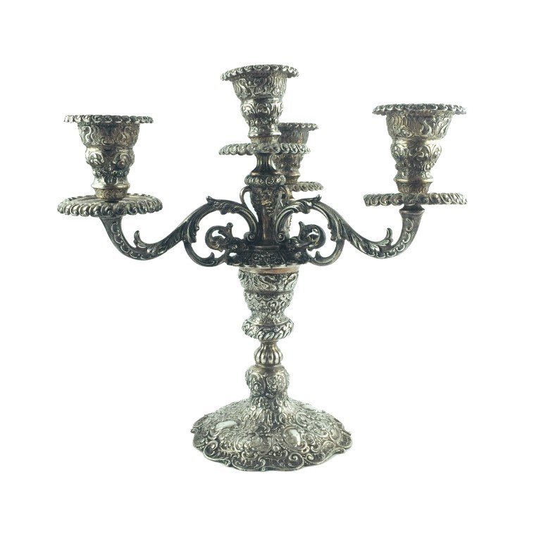Par de candelabros cuatro luces con opción a candelero en plata alemana 935, totalmente cincelada «hojas» y «flores». 29 x 30 cm. Peso 2.600 gr.
