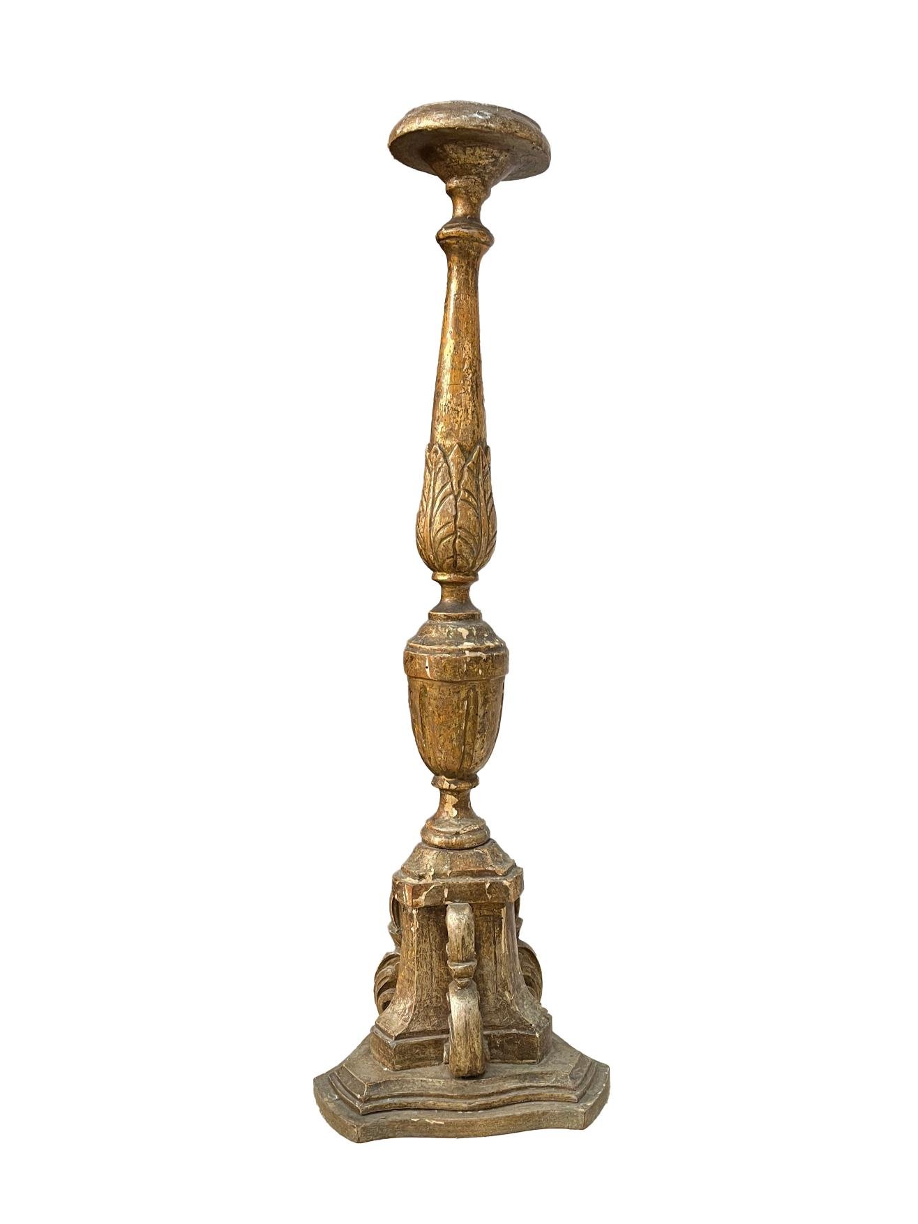 Candelero europeo s. XVIII en madera tallada y plateada obre estuco, con depósito para sebo en hojalata. Alto 83 cm.