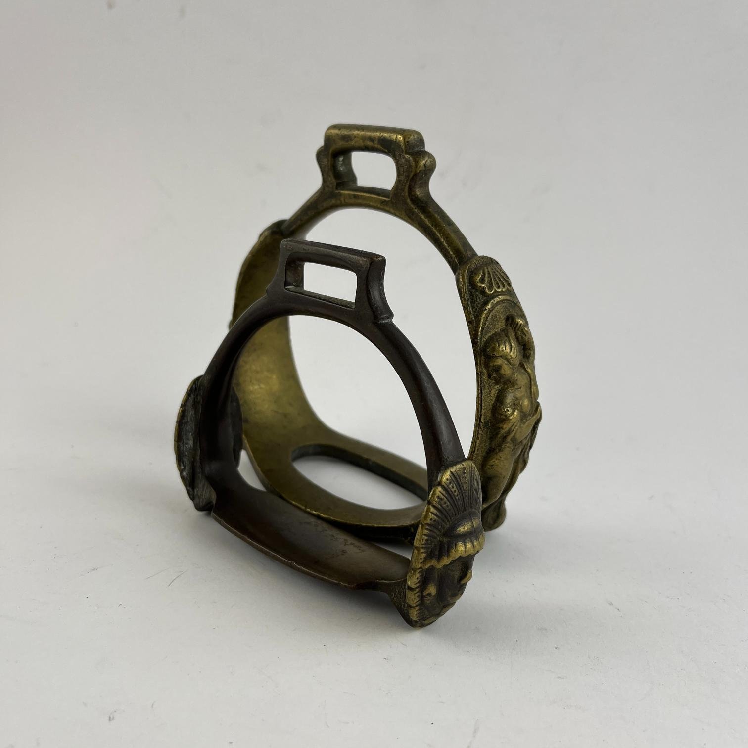 Dos estribos diferentes, en bronce, s. XIX. Uno con laterales decorados «desnudo femenino», de un alto de 13 cm; otro decorado «cara de indio», de un alto 10 de cm.