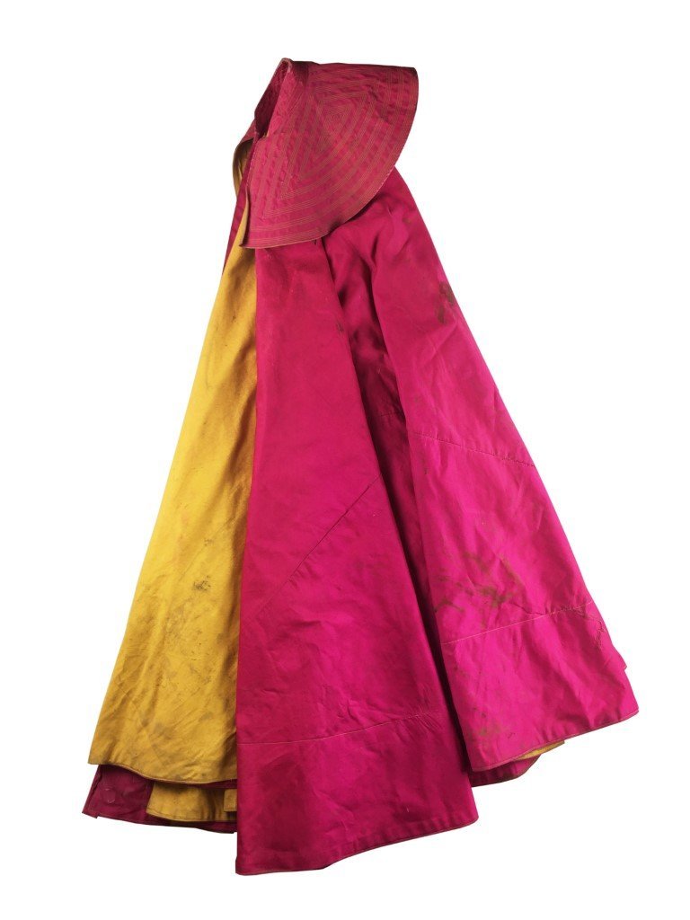 Capote de brega perteneciente al torero Pacomio Peribáñez (Valladolid 1882 – Madrid 1964), sellado «Pacomio» en interior. Con antiguas manchas de sangre.
