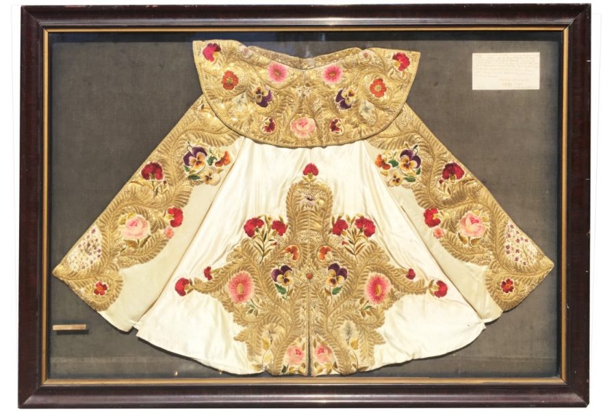 Capote de paseo de torero en seda color blanco bordada «flores» en hilos de seda de varios colores, decorada con filigrana y lentejuelas doradas. Perteneciente al torero Manolo Bienvenida (Dos Hermanas, 1912 – San Sebastián, 1938). Enmarcado. Acompañado de carta manuscrita fechada en Montevideo el 17 de abril de 1939, firmada por Adolfo Rojas, «El Nene, Matador de Novillos Toros», donde se certifica que el capote fue utilizado por Bienvenida en Lima en los años 1926 y 1927, quien lo obsequiara al presidente del Perú Augusto Bernardino Leguía, y que «me fue obsequiado para mi carrera taurina, y que obsequio al señor Esteban Cámpora para su museo taurino», ubicado en Punta del Este.