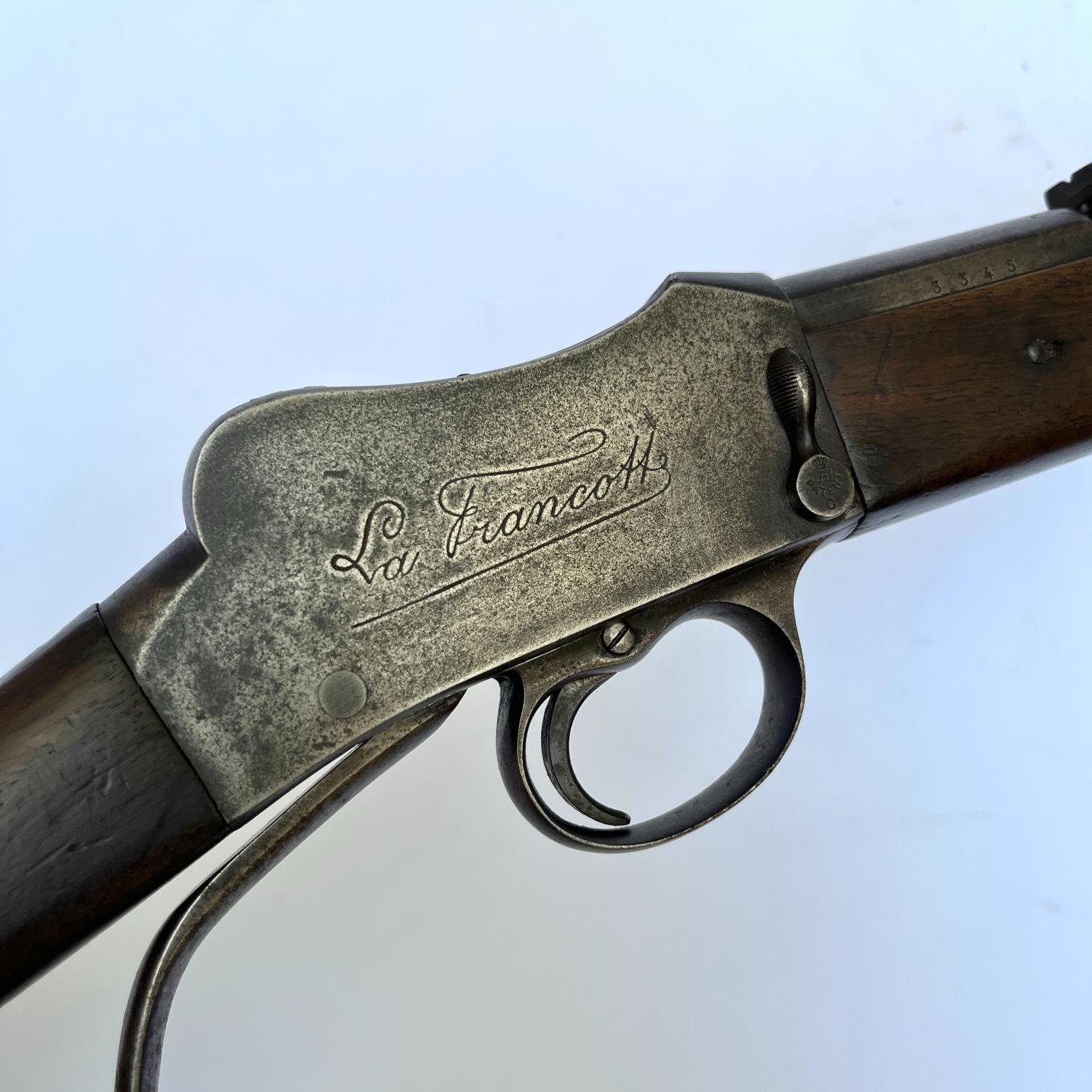 Carabina La Francotte, belga, sistema Martini-Francotte, modelo Cadet, en calibre 6 mm Flobert, para tiro de salón. Falta baqueta. Funcionando.