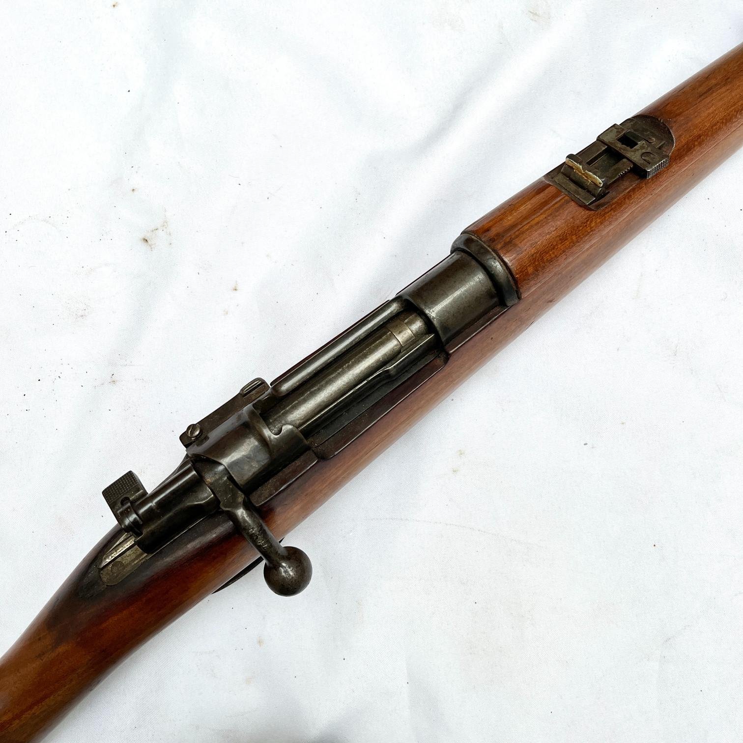 Carabina de cerrojo Mauser, modelo 1893, calibre 7 x 57 mm. Completa, reempavonada, con salida de gases no original y algunas picaduras exteriores en el cañón.