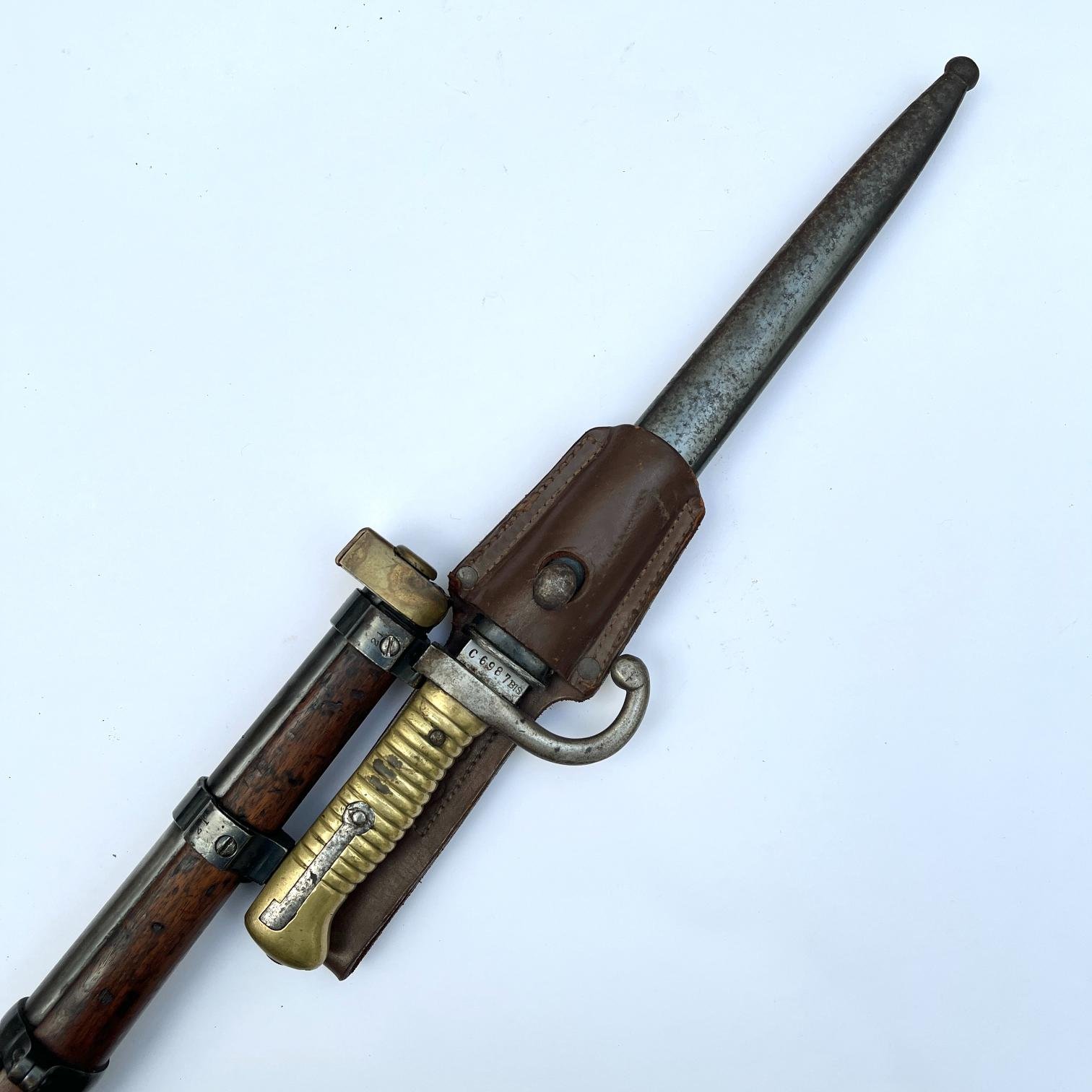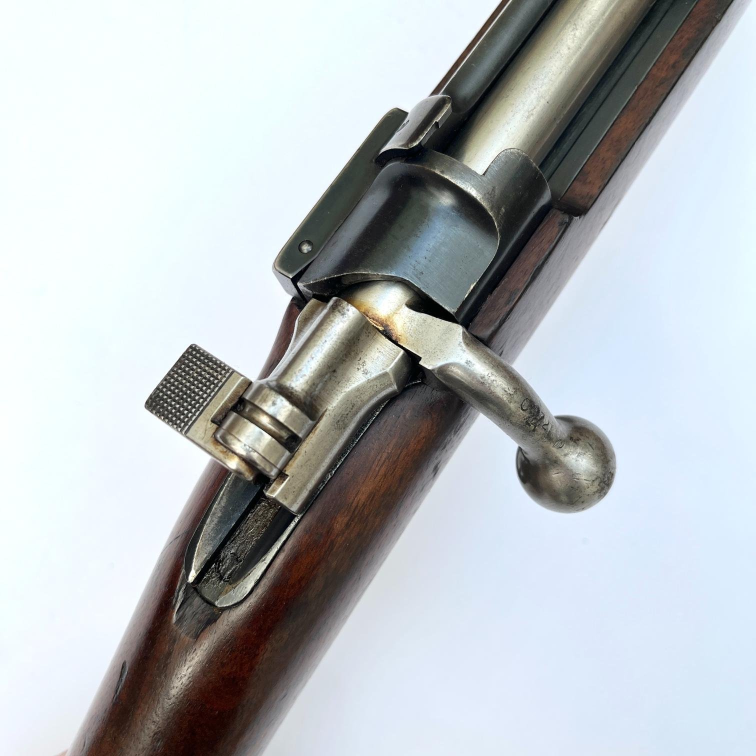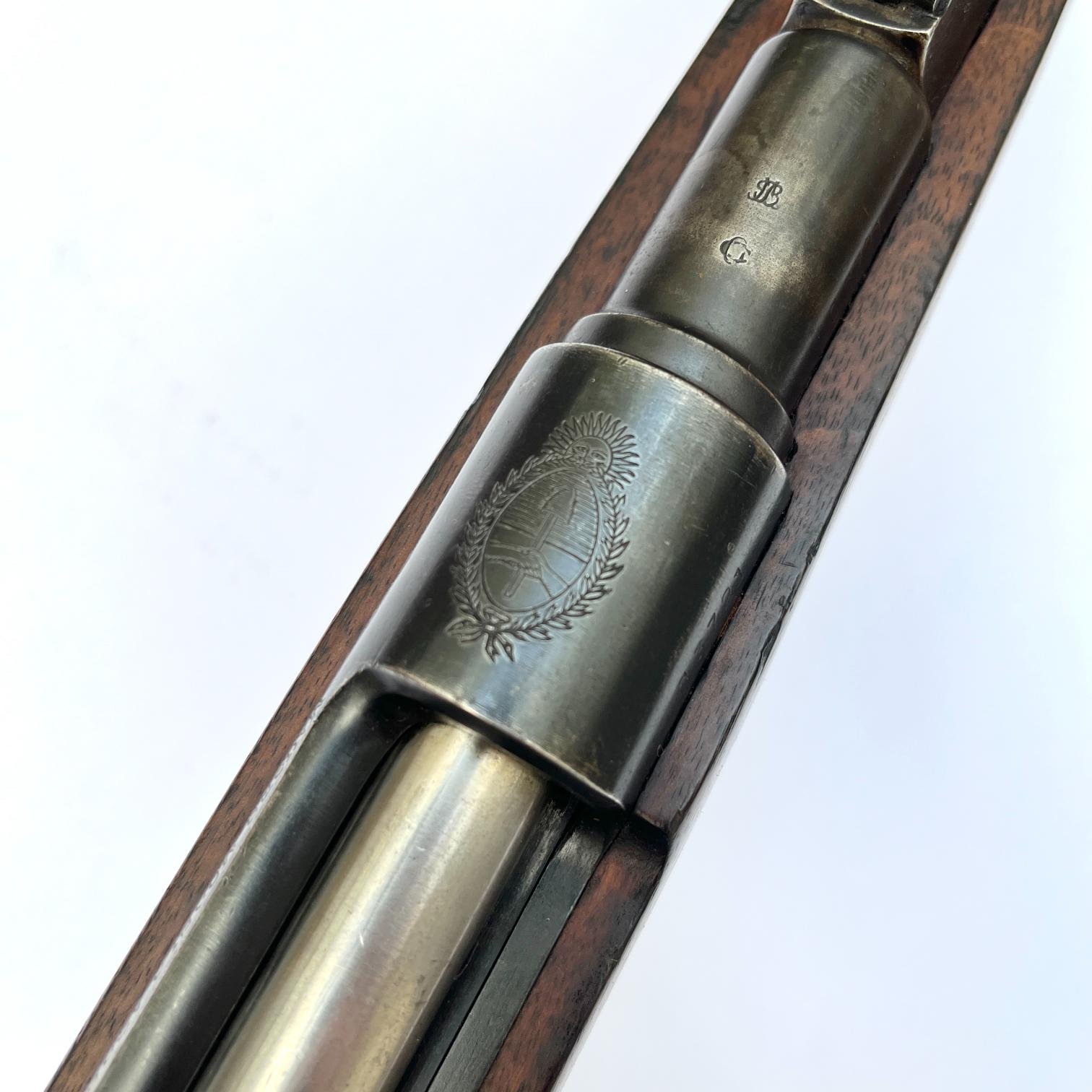 Carabina Mauser de caballería, modelo 1891, calibre 7,65 x 53 mm. Cajón de mecanismos con escudo de armas y marcaje «MAUSER MODELO ARGENTINO 1891, DEUTSCHE WAFFEN-UND MUNITIONSFABRIKEN, BERLIN». Cerrojo, acción y culata con numeración coincidente. Bayoneta con empuñadura en bronce, vaina metálica y tahalí en cuero, numerada y marcada “EA”. Tapabocas en latón. 1931 y 1932 estas carabinas se modificaron para adaptar bayonetas del fusil Remington Rolling Block M1879, fabricadas en Kirschbaum, Solingen, para dotación de unidades de Ingenieros del Ejército Argentino. Proveniencia: ex colección Enrique Gómez Haedo.