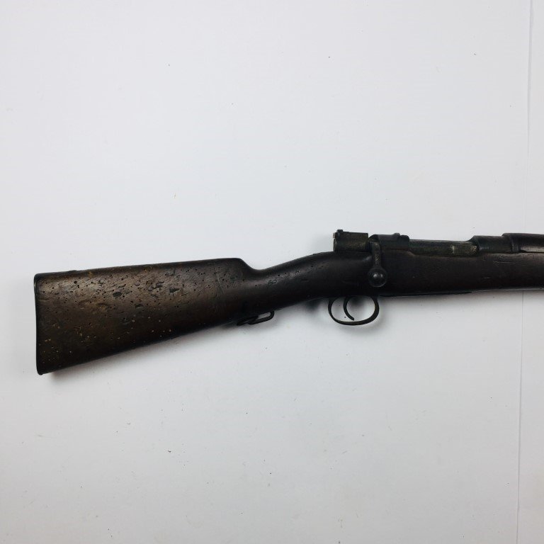 Carabina Mauser para caballería modelo 1895 calibre 7 x 55. No. de serie 2301. Fabricada por Herstal, Lieja. Culata con tiros de polilla.