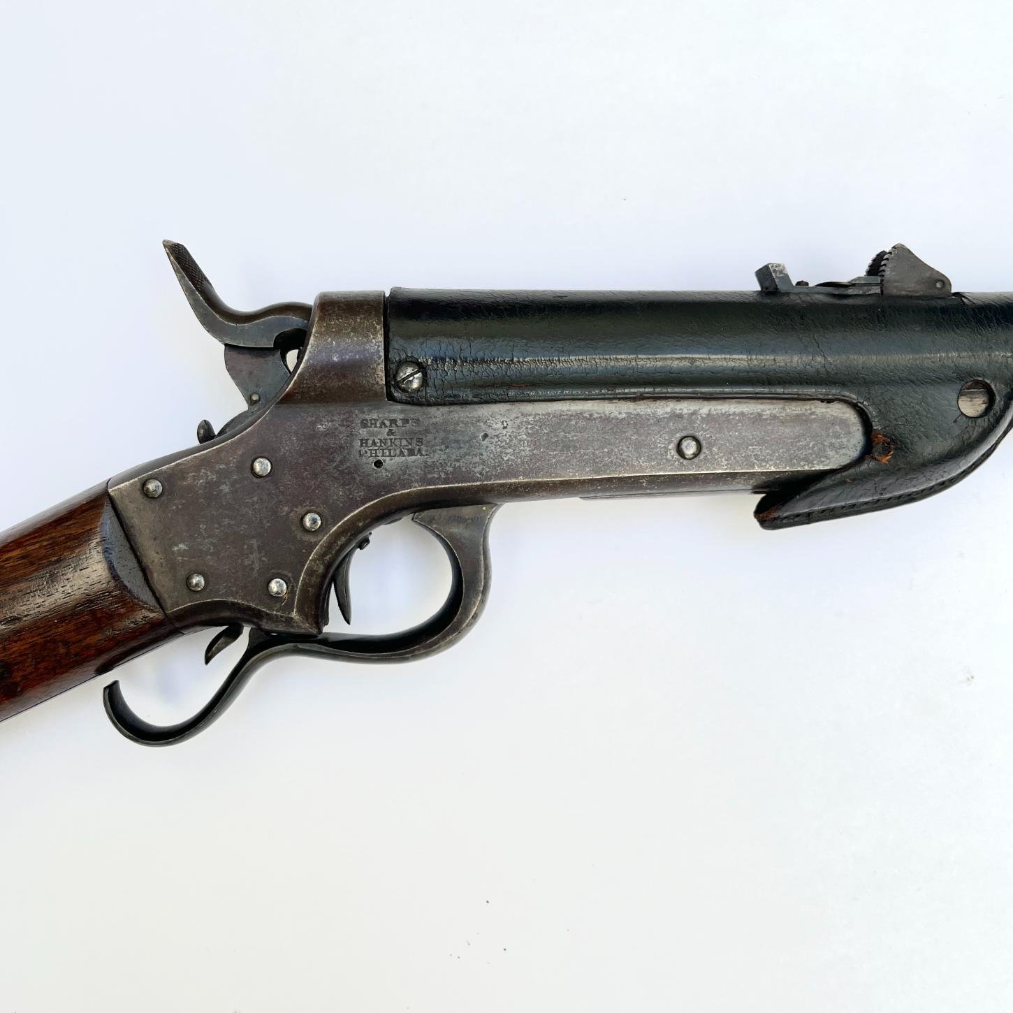 Carabina Sharps & Hankins, breech loading, modelo Naval 1862. Cañón de 24 pulgadas en calibre .52RF, con cubierta protectora en cuero para uso a bordo. Cajón de mecanismos marcado «SHARPS & HANKINS, PHILADA. SHARP PATENT 1859». Culata en madera con cantonera en bronce. Estas armas fueron de dotación de buques de la Armada estadounidense a partir de 1862 y hasta finalizar la Guerra de Secesión en 1865.